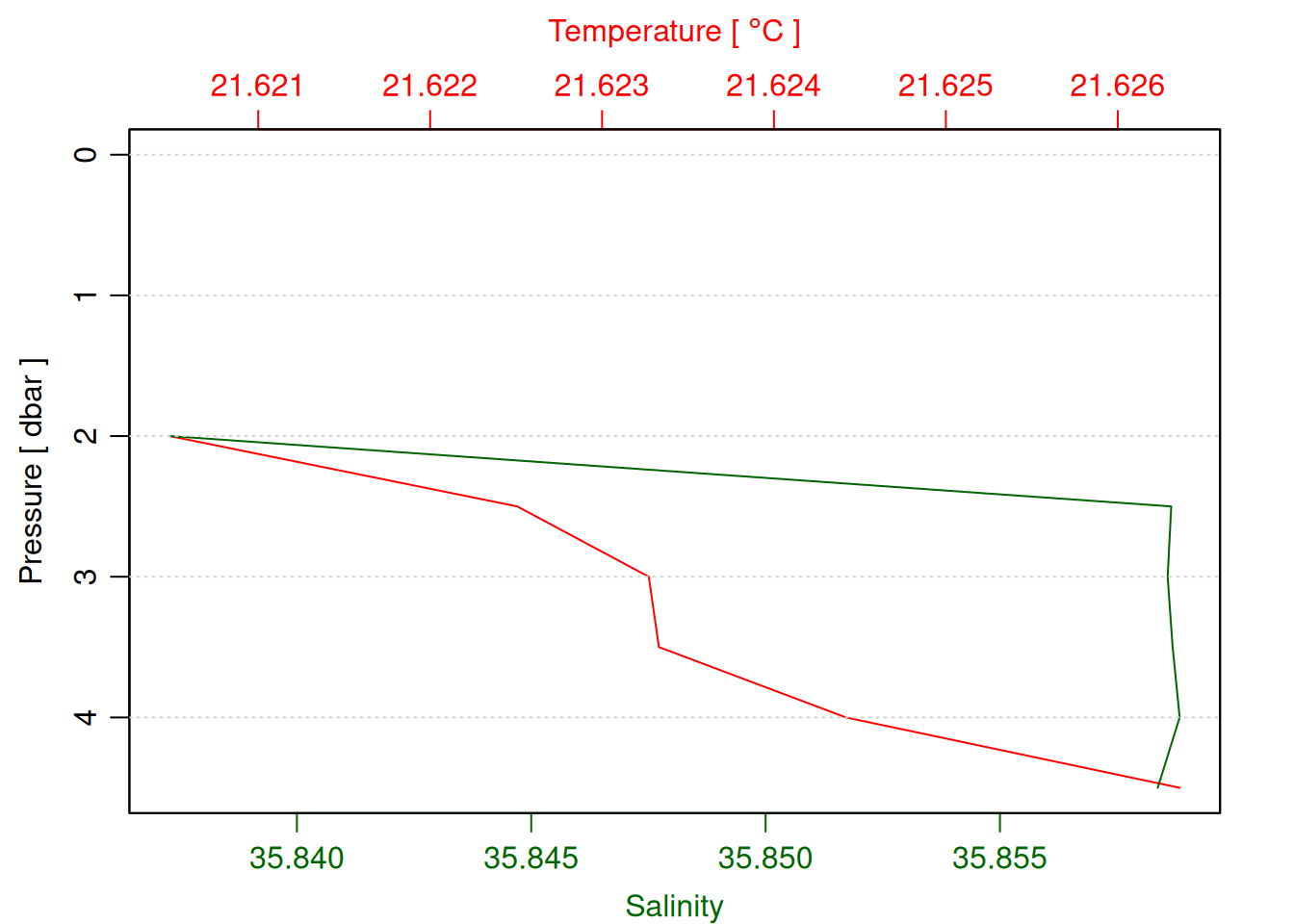 tryCatch({ oce::plotProfile(decimated_cast)# TODO: plot chl & do (prereq handle other_params in ctd_load_from_csv call above)}, error =function(e) {print("decimated cast not found")})
