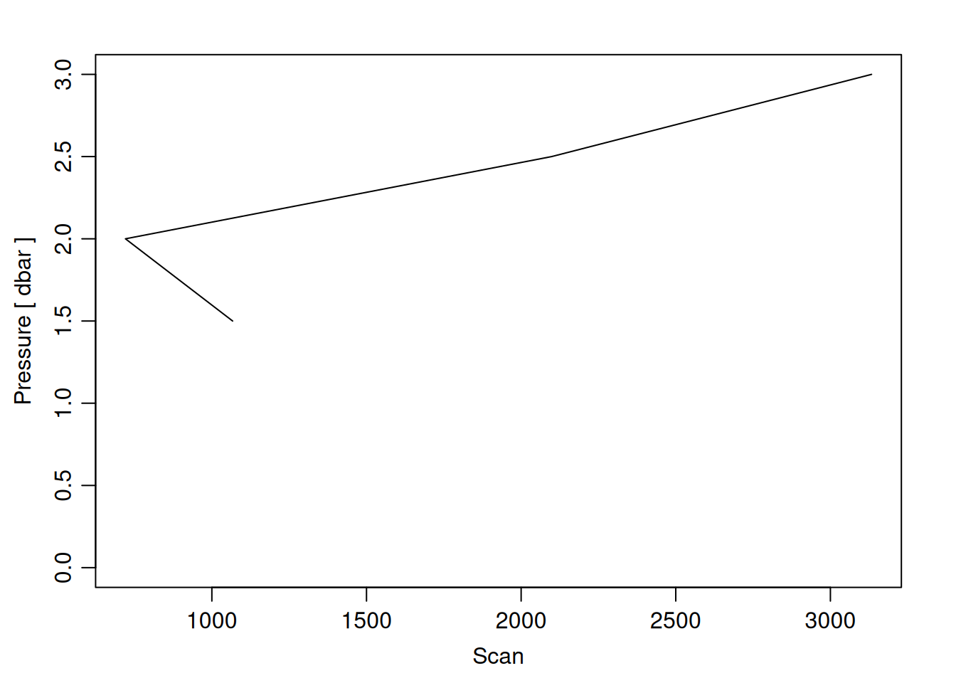tryCatch({ trimmed_cast <-ctdTrim(cast) decimated_cast <-ctdDecimate(trimmed_cast, p =0.5)# plotting can cause the xlim failureplotScan(decimated_cast)# === export === cast_df <-as.data.frame(decimated_cast@data)# Add metadata cast_df <-mutate( cast_df,station = station_id,cruise_id = cruise_id )# drop NA rows left by cleaning cast_df <-subset(cast_df, !is.na(scan))# create folder if doesn't exist clean_data_loc <- here::here("data/02_clean")try(fs::dir_create(clean_data_loc))# save ctd to .csvwrite.csv(cast_df, glue("{clean_data_loc}/{params$cast_id}.csv"))}, error =function(e) {cat("\n=== CTD PROCESSING ERROR ===\n")cat("Cast ID:", params$cast_id, "\n")cat("Error message:\n", conditionMessage(e), "\n\n")# Safely inspect objects that might or might not exist when the error happenedif (exists("decimated_cast")) { df <-try(as.data.frame(decimated_cast@data), silent =TRUE)if (!inherits(df, "try-error")) {cat("Dataframe columns:\n")print(names(df))cat("\nSummary of key columns (scan, pressure, temperature, salinity if present):\n") known_cols <-intersect(c("scan", "pressure", "temp", "temperature", "salinity", "conductivity"), names(df))print(summary(df[known_cols], digits =3))cat("\nHead of dataframe:\n")print(head(df)) } else {cat("Could not extract dataframe from decimated_cast.\n") } } else {cat("decimated_cast was never created before the error.\n") }cat("\n=== END ERROR DEBUG INFO ===\n\n")})