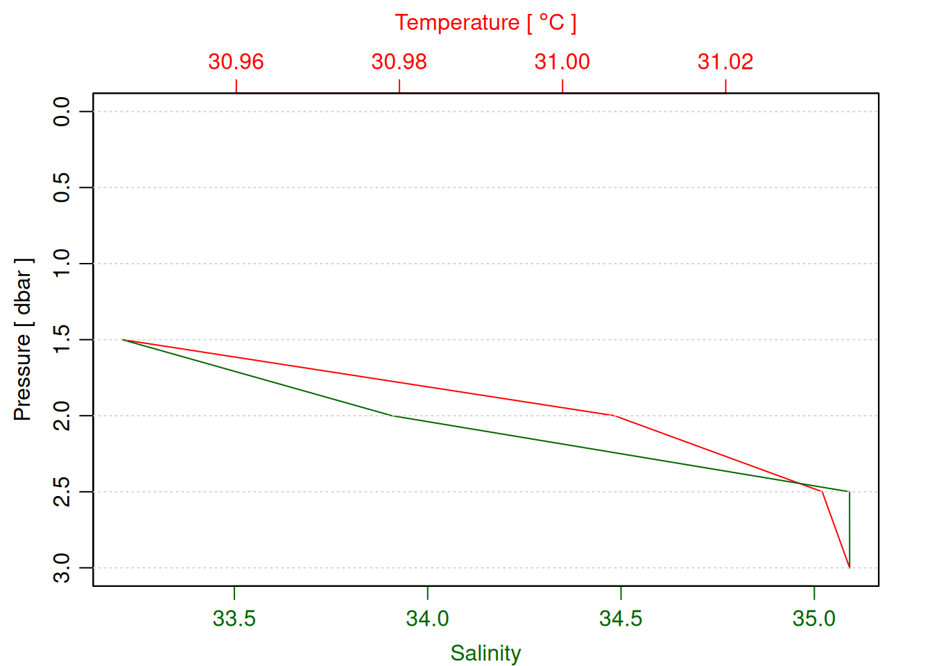 tryCatch({ oce::plotProfile(decimated_cast)# TODO: plot chl & do (prereq handle other_params in ctd_load_from_csv call above)}, error =function(e) {print("decimated cast not found")})
