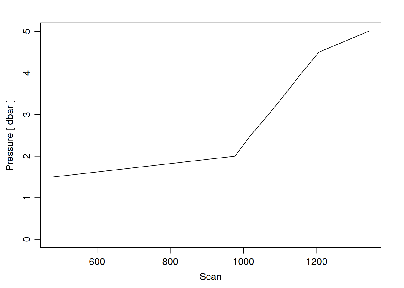 tryCatch({ trimmed_cast <-ctdTrim(cast) decimated_cast <-ctdDecimate(trimmed_cast, p =0.5)# plotting can cause the xlim failureplotScan(decimated_cast)# === export === cast_df <-as.data.frame(decimated_cast@data)# Add metadata cast_df <-mutate( cast_df,station = station_id,cruise_id = cruise_id )# drop NA rows left by cleaning cast_df <-subset(cast_df, !is.na(scan))# create folder if doesn't exist clean_data_loc <- here::here("data/02_clean")try(fs::dir_create(clean_data_loc))# save ctd to .csvwrite.csv(cast_df, glue("{clean_data_loc}/{params$cast_id}.csv"))}, error =function(e) {cat("\n=== CTD PROCESSING ERROR ===\n")cat("Cast ID:", params$cast_id, "\n")cat("Error message:\n", conditionMessage(e), "\n\n")# Safely inspect objects that might or might not exist when the error happenedif (exists("decimated_cast")) { df <-try(as.data.frame(decimated_cast@data), silent =TRUE)if (!inherits(df, "try-error")) {cat("Dataframe columns:\n")print(names(df))cat("\nSummary of key columns (scan, pressure, temperature, salinity if present):\n") known_cols <-intersect(c("scan", "pressure", "temp", "temperature", "salinity", "conductivity"), names(df))print(summary(df[known_cols], digits =3))cat("\nHead of dataframe:\n")print(head(df)) } else {cat("Could not extract dataframe from decimated_cast.\n") } } else {cat("decimated_cast was never created before the error.\n") }cat("\n=== END ERROR DEBUG INFO ===\n\n")})
