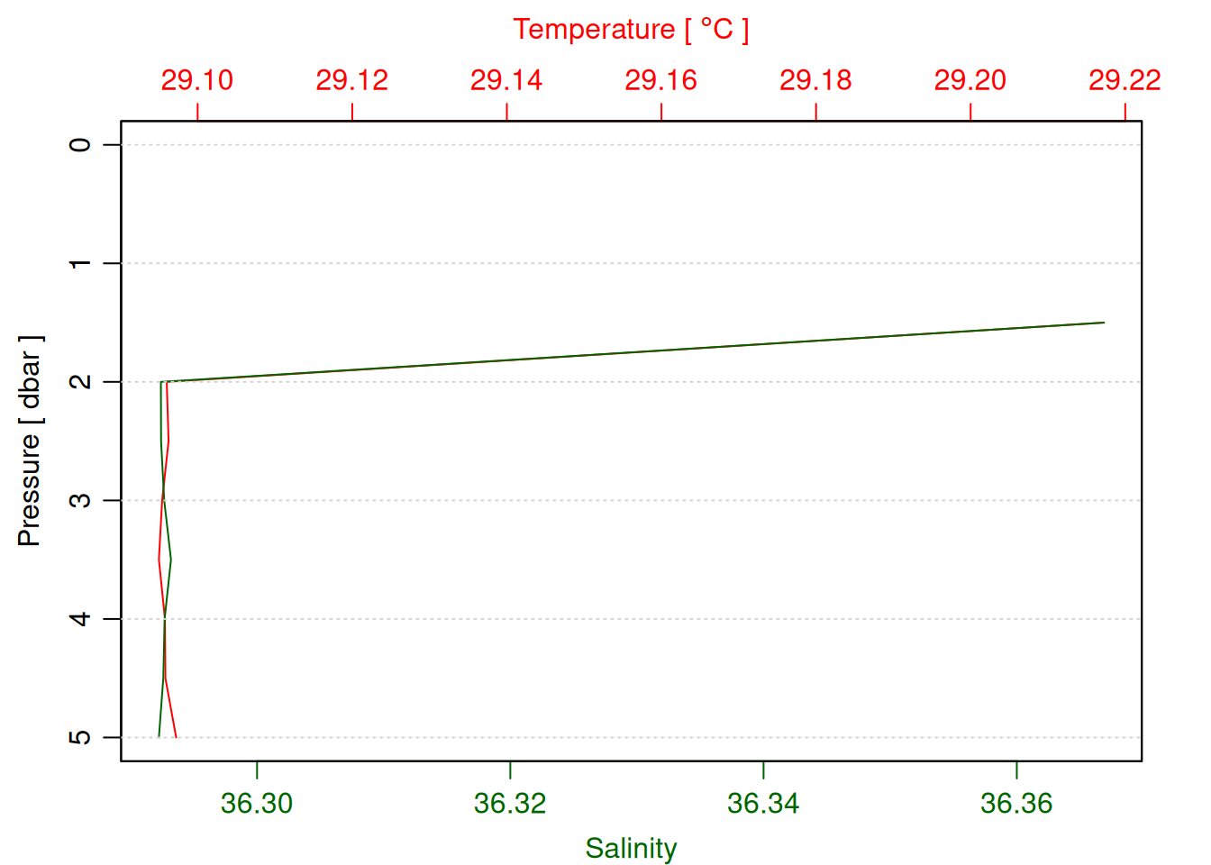 tryCatch({ oce::plotProfile(decimated_cast)# TODO: plot chl & do (prereq handle other_params in ctd_load_from_csv call above)}, error =function(e) {print("decimated cast not found")})
