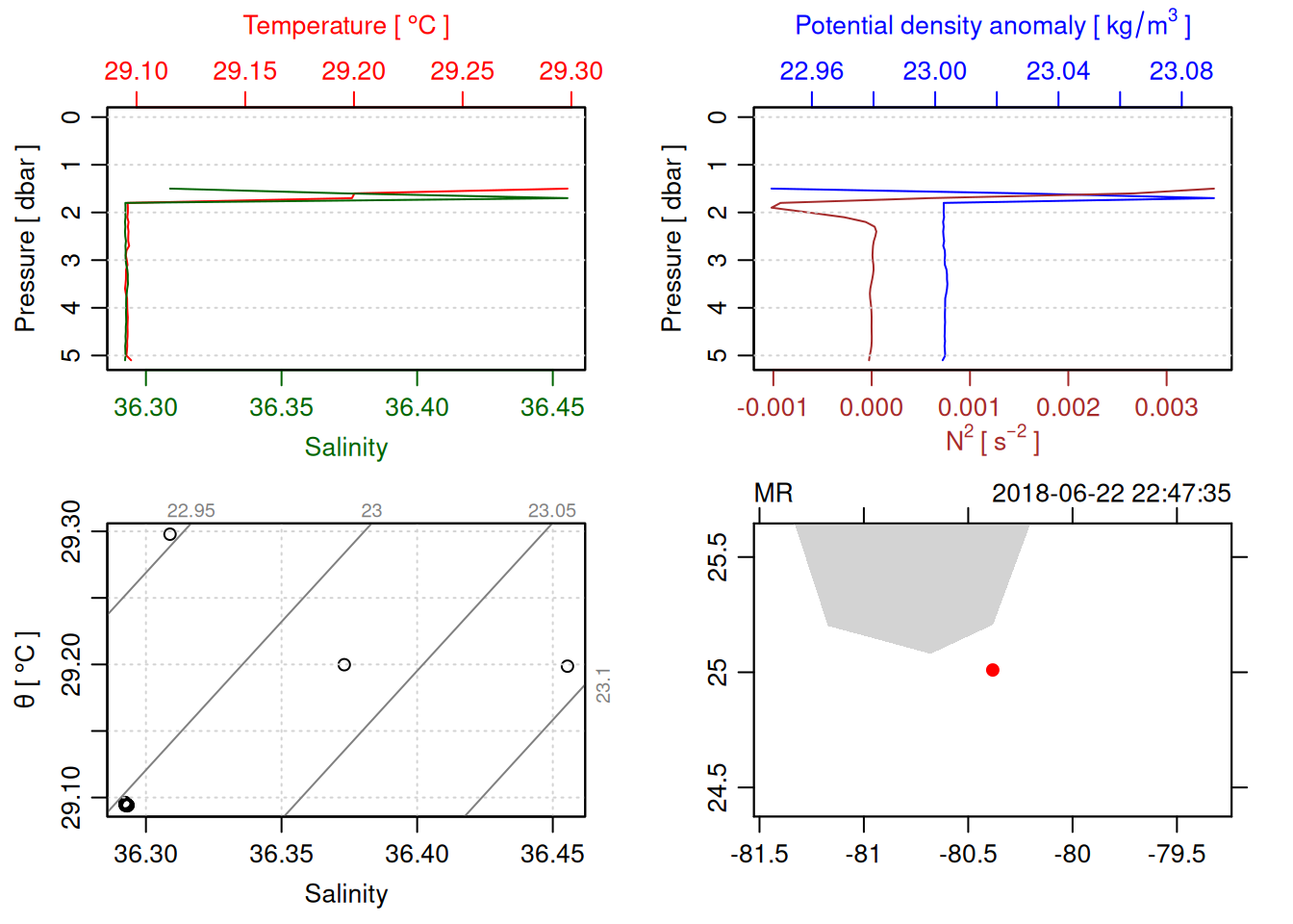 # TODO: Include param here that specifies to handle QC flags. This should be done before converting to a OCE object. QC flag columns are listed in [this spreadsheet](https://docs.google.com/spreadsheets/d/1uCxEmJRqErU-HCQiRQ1FpyiIqtNaGgMSBI0WvrtwBRU/edit?gid=137286311#gid=137286311) and are not supposed to be included in the oce object. QC param values are : # 1 good# 2 +/- 3*std_dev# 4 +/- 5*std_dev# 9 missing# Data column should be set to NA if corresponding QC column has value greater than threshold (recommended threshold is 5*std_dev).# Will need to loop through *_qc columns.# TODO: drop spikes (how? low-pass?).# TODO: combine replicate sensors (eg temp1 temp2).