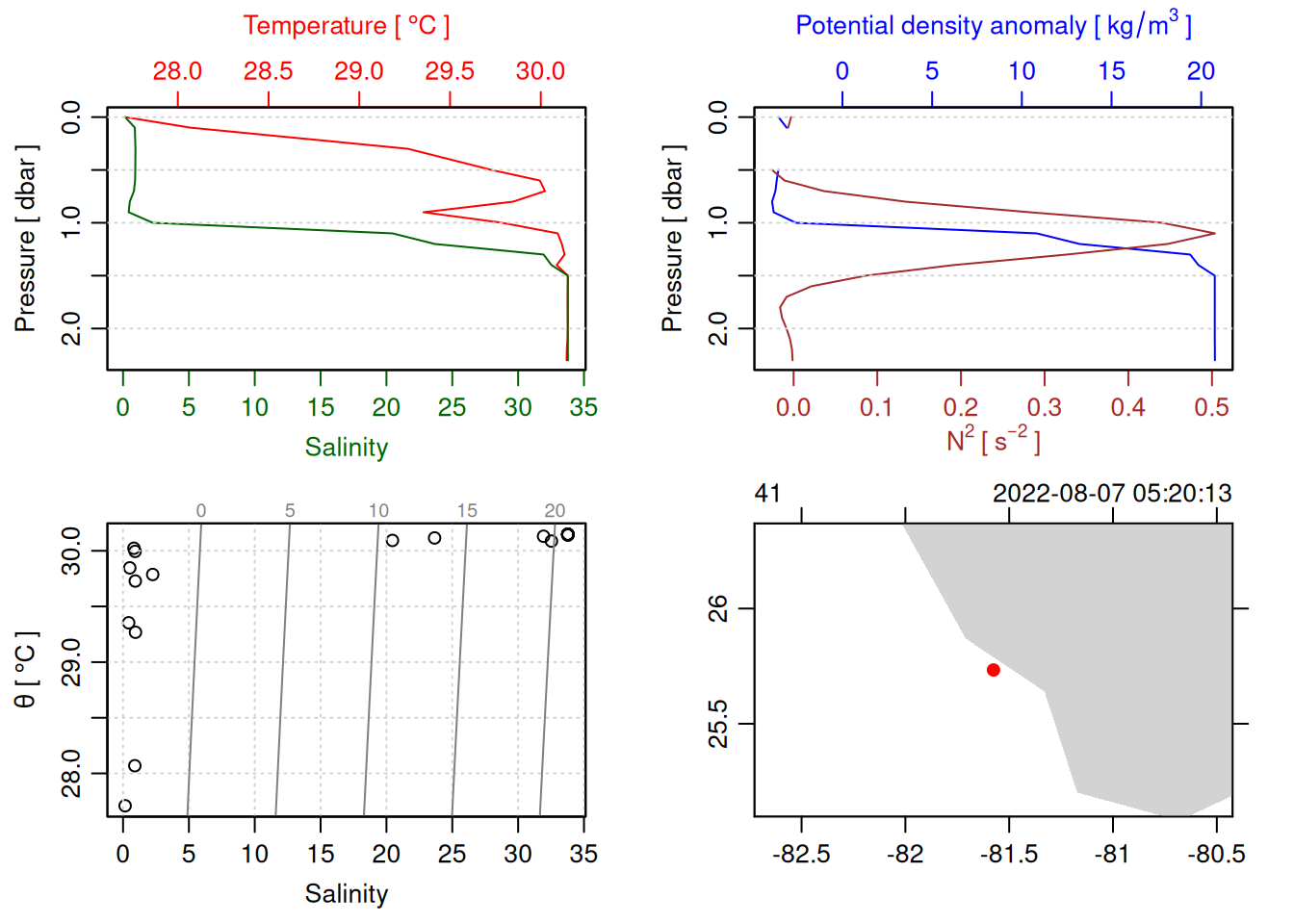 tryCatch({ trimmed_cast <-ctdTrim(cast) decimated_cast <-ctdDecimate(trimmed_cast, p =0.1)# plotting can cause the xlim failureplot(decimated_cast)# === export ===# Get the scan numbers that remain after cleaning cleaned_scans <- decimated_cast@data$scan# Load original raw data to keep all columns ctd_raw <- readr::read_csv(dataFile, show_col_types =FALSE)# Filter raw data to only include the cleaned scans cast_df <- ctd_raw %>%filter(!is.na(sea_water_pressure)) %>%# Remove rows without pressure datamutate(row_num =row_number()) %>%filter(row_num %in% cleaned_scans) %>%select(-row_num)# Add metadata cast_df <-mutate( cast_df,station = station_id,cruise_id = cruise_id )# Check if there are any rows in the cleaned dataif (nrow(cast_df) ==0) {cat("\n=== WARNING: NO DATA AFTER CLEANING ===\n")cat("Cast ID:", params$cast_id, "\n")cat("Station:", station_id, "\n")cat("Cruise:", cruise_id, "\n\n")cat("Raw data rows (with pressure):", sum(!is.na(ctd_raw$sea_water_pressure)), "\n")cat("Cleaned scans to keep:", length(cleaned_scans), "\n")cat("Resulting rows:", nrow(cast_df), "\n\n")cat("Raw data summary:\n")print(summary(ctd_raw[c("sea_water_pressure", "sea_water_temperature", "sea_water_salinity")]))cat("\nCleaned scans (first 20):\n")print(head(cleaned_scans, 20))cat("\n=== CSV FILE NOT CREATED (no data) ===\n\n") } else {# create folder if doesn't exist clean_data_loc <- here::here("data/02_clean")try(fs::dir_create(clean_data_loc))# save ctd to .csv (without row names/indices)write.csv(cast_df, glue("{clean_data_loc}/{params$cast_id}.csv"), row.names =FALSE)cat("Successfully saved", nrow(cast_df), "rows to", glue("{params$cast_id}.csv"), "\n") }}, error =function(e) {cat("\n=== CTD PROCESSING ERROR ===\n")cat("Cast ID:", params$cast_id, "\n")cat("Error message:\n", conditionMessage(e), "\n\n")# Safely inspect objects that might or might not exist when the error happenedif (exists("decimated_cast")) { df <-try(as.data.frame(decimated_cast@data), silent =TRUE)if (!inherits(df, "try-error")) {cat("Dataframe columns:\n")print(names(df))cat("\nSummary of key columns (scan, pressure, temperature, salinity if present):\n") known_cols <-intersect(c("scan", "pressure", "temp", "temperature", "salinity", "conductivity"), names(df))print(summary(df[known_cols], digits =3))cat("\nHead of dataframe:\n")print(head(df)) } else {cat("Could not extract dataframe from decimated_cast.\n") } } else {cat("decimated_cast was never created before the error.\n") }cat("\n=== END ERROR DEBUG INFO ===\n\n")})