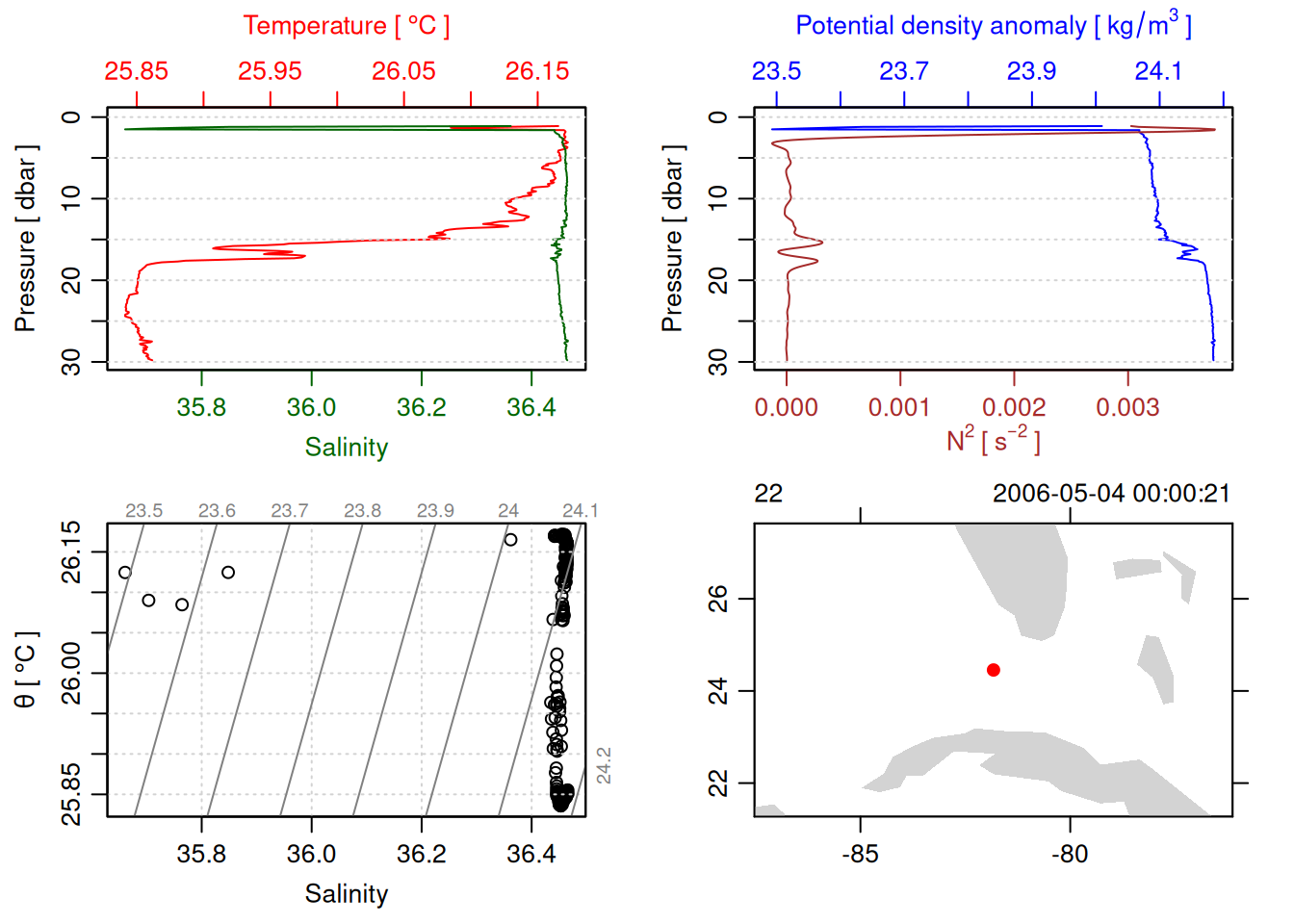 tryCatch({ trimmed_cast <-ctdTrim(cast) decimated_cast <-ctdDecimate(trimmed_cast, p =0.1)# plotting can cause the xlim failureplot(decimated_cast)# === export ===# Get the scan numbers that remain after cleaning cleaned_scans <- decimated_cast@data$scan# Load original raw data to keep all columns ctd_raw <- readr::read_csv(dataFile, show_col_types =FALSE)# Filter raw data to only include the cleaned scans cast_df <- ctd_raw %>%filter(!is.na(sea_water_pressure)) %>%# Remove rows without pressure datamutate(row_num =row_number()) %>%filter(row_num %in% cleaned_scans) %>%select(-row_num)# Add metadata cast_df <-mutate( cast_df,station = station_id,cruise_id = cruise_id )# Check if there are any rows in the cleaned dataif (nrow(cast_df) ==0) {cat("\n=== WARNING: NO DATA AFTER CLEANING ===\n")cat("Cast ID:", params$cast_id, "\n")cat("Station:", station_id, "\n")cat("Cruise:", cruise_id, "\n\n")cat("Raw data rows (with pressure):", sum(!is.na(ctd_raw$sea_water_pressure)), "\n")cat("Cleaned scans to keep:", length(cleaned_scans), "\n")cat("Resulting rows:", nrow(cast_df), "\n\n")cat("Raw data summary:\n")print(summary(ctd_raw[c("sea_water_pressure", "sea_water_temperature", "sea_water_salinity")]))cat("\nCleaned scans (first 20):\n")print(head(cleaned_scans, 20))cat("\n=== CSV FILE NOT CREATED (no data) ===\n\n") } else {# create folder if doesn't exist clean_data_loc <- here::here("data/02_clean")try(fs::dir_create(clean_data_loc))# save ctd to .csv (without row names/indices)write.csv(cast_df, glue("{clean_data_loc}/{params$cast_id}.csv"), row.names =FALSE)cat("Successfully saved", nrow(cast_df), "rows to", glue("{params$cast_id}.csv"), "\n") }}, error =function(e) {cat("\n=== CTD PROCESSING ERROR ===\n")cat("Cast ID:", params$cast_id, "\n")cat("Error message:\n", conditionMessage(e), "\n\n")# Safely inspect objects that might or might not exist when the error happenedif (exists("decimated_cast")) { df <-try(as.data.frame(decimated_cast@data), silent =TRUE)if (!inherits(df, "try-error")) {cat("Dataframe columns:\n")print(names(df))cat("\nSummary of key columns (scan, pressure, temperature, salinity if present):\n") known_cols <-intersect(c("scan", "pressure", "temp", "temperature", "salinity", "conductivity"), names(df))print(summary(df[known_cols], digits =3))cat("\nHead of dataframe:\n")print(head(df)) } else {cat("Could not extract dataframe from decimated_cast.\n") } } else {cat("decimated_cast was never created before the error.\n") }cat("\n=== END ERROR DEBUG INFO ===\n\n")})
