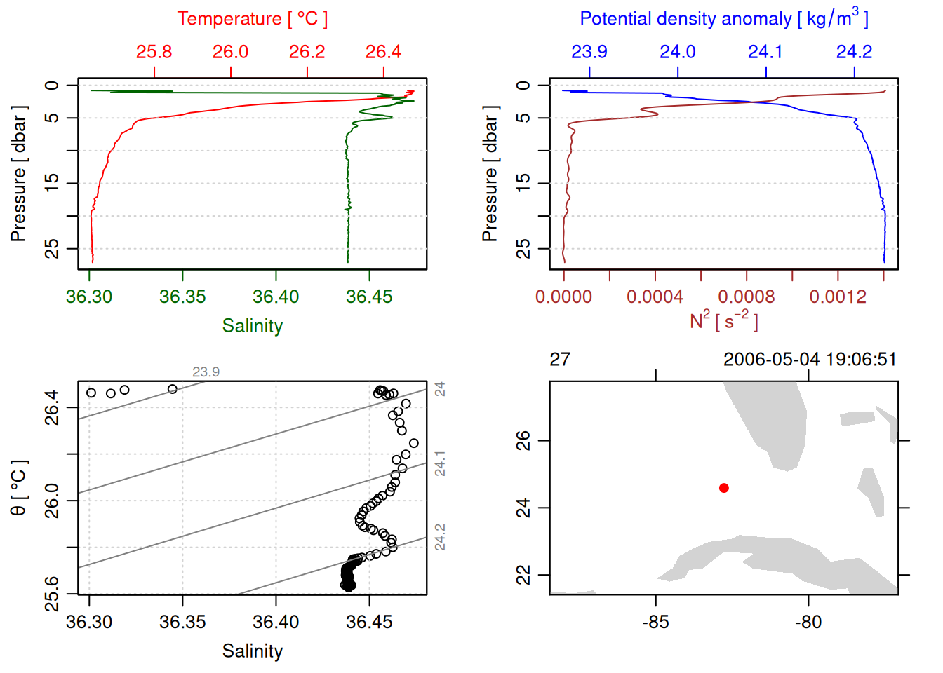 tryCatch({ trimmed_cast <-ctdTrim(cast) decimated_cast <-ctdDecimate(trimmed_cast, p =0.1)# plotting can cause the xlim failureplot(decimated_cast)# === export ===# Get the scan numbers that remain after cleaning cleaned_scans <- decimated_cast@data$scan# Load original raw data to keep all columns ctd_raw <- readr::read_csv(dataFile, show_col_types =FALSE)# Filter raw data to only include the cleaned scans cast_df <- ctd_raw %>%filter(!is.na(sea_water_pressure)) %>%# Remove rows without pressure datamutate(row_num =row_number()) %>%filter(row_num %in% cleaned_scans) %>%select(-row_num)# Add metadata cast_df <-mutate( cast_df,station = station_id,cruise_id = cruise_id )# Check if there are any rows in the cleaned dataif (nrow(cast_df) ==0) {cat("\n=== WARNING: NO DATA AFTER CLEANING ===\n")cat("Cast ID:", params$cast_id, "\n")cat("Station:", station_id, "\n")cat("Cruise:", cruise_id, "\n\n")cat("Raw data rows (with pressure):", sum(!is.na(ctd_raw$sea_water_pressure)), "\n")cat("Cleaned scans to keep:", length(cleaned_scans), "\n")cat("Resulting rows:", nrow(cast_df), "\n\n")cat("Raw data summary:\n")print(summary(ctd_raw[c("sea_water_pressure", "sea_water_temperature", "sea_water_salinity")]))cat("\nCleaned scans (first 20):\n")print(head(cleaned_scans, 20))cat("\n=== CSV FILE NOT CREATED (no data) ===\n\n") } else {# create folder if doesn't exist clean_data_loc <- here::here("data/02_clean")try(fs::dir_create(clean_data_loc))# save ctd to .csv (without row names/indices)write.csv(cast_df, glue("{clean_data_loc}/{params$cast_id}.csv"), row.names =FALSE)cat("Successfully saved", nrow(cast_df), "rows to", glue("{params$cast_id}.csv"), "\n") }}, error =function(e) {cat("\n=== CTD PROCESSING ERROR ===\n")cat("Cast ID:", params$cast_id, "\n")cat("Error message:\n", conditionMessage(e), "\n\n")# Safely inspect objects that might or might not exist when the error happenedif (exists("decimated_cast")) { df <-try(as.data.frame(decimated_cast@data), silent =TRUE)if (!inherits(df, "try-error")) {cat("Dataframe columns:\n")print(names(df))cat("\nSummary of key columns (scan, pressure, temperature, salinity if present):\n") known_cols <-intersect(c("scan", "pressure", "temp", "temperature", "salinity", "conductivity"), names(df))print(summary(df[known_cols], digits =3))cat("\nHead of dataframe:\n")print(head(df)) } else {cat("Could not extract dataframe from decimated_cast.\n") } } else {cat("decimated_cast was never created before the error.\n") }cat("\n=== END ERROR DEBUG INFO ===\n\n")})