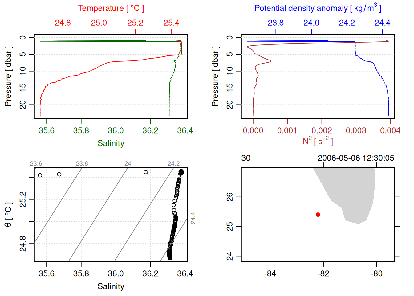 tryCatch({ trimmed_cast <-ctdTrim(cast) decimated_cast <-ctdDecimate(trimmed_cast, p =0.1)# plotting can cause the xlim failureplot(decimated_cast)# === export ===# Get the scan numbers that remain after cleaning cleaned_scans <- decimated_cast@data$scan# Load original raw data to keep all columns ctd_raw <- readr::read_csv(dataFile, show_col_types =FALSE)# Filter raw data to only include the cleaned scans cast_df <- ctd_raw %>%filter(!is.na(sea_water_pressure)) %>%# Remove rows without pressure datamutate(row_num =row_number()) %>%filter(row_num %in% cleaned_scans) %>%select(-row_num)# Add metadata cast_df <-mutate( cast_df,station = station_id,cruise_id = cruise_id )# Check if there are any rows in the cleaned dataif (nrow(cast_df) ==0) {cat("\n=== WARNING: NO DATA AFTER CLEANING ===\n")cat("Cast ID:", params$cast_id, "\n")cat("Station:", station_id, "\n")cat("Cruise:", cruise_id, "\n\n")cat("Raw data rows (with pressure):", sum(!is.na(ctd_raw$sea_water_pressure)), "\n")cat("Cleaned scans to keep:", length(cleaned_scans), "\n")cat("Resulting rows:", nrow(cast_df), "\n\n")cat("Raw data summary:\n")print(summary(ctd_raw[c("sea_water_pressure", "sea_water_temperature", "sea_water_salinity")]))cat("\nCleaned scans (first 20):\n")print(head(cleaned_scans, 20))cat("\n=== CSV FILE NOT CREATED (no data) ===\n\n") } else {# create folder if doesn't exist clean_data_loc <- here::here("data/02_clean")try(fs::dir_create(clean_data_loc))# save ctd to .csv (without row names/indices)write.csv(cast_df, glue("{clean_data_loc}/{params$cast_id}.csv"), row.names =FALSE)cat("Successfully saved", nrow(cast_df), "rows to", glue("{params$cast_id}.csv"), "\n") }}, error =function(e) {cat("\n=== CTD PROCESSING ERROR ===\n")cat("Cast ID:", params$cast_id, "\n")cat("Error message:\n", conditionMessage(e), "\n\n")# Safely inspect objects that might or might not exist when the error happenedif (exists("decimated_cast")) { df <-try(as.data.frame(decimated_cast@data), silent =TRUE)if (!inherits(df, "try-error")) {cat("Dataframe columns:\n")print(names(df))cat("\nSummary of key columns (scan, pressure, temperature, salinity if present):\n") known_cols <-intersect(c("scan", "pressure", "temp", "temperature", "salinity", "conductivity"), names(df))print(summary(df[known_cols], digits =3))cat("\nHead of dataframe:\n")print(head(df)) } else {cat("Could not extract dataframe from decimated_cast.\n") } } else {cat("decimated_cast was never created before the error.\n") }cat("\n=== END ERROR DEBUG INFO ===\n\n")})