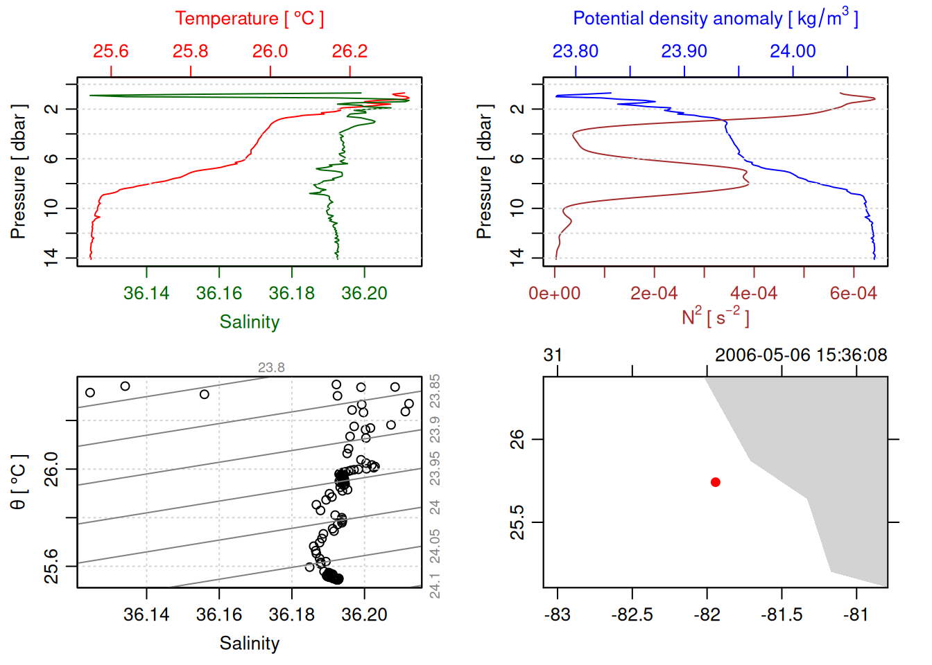 tryCatch({ trimmed_cast <-ctdTrim(cast) decimated_cast <-ctdDecimate(trimmed_cast, p =0.1)# plotting can cause the xlim failureplot(decimated_cast)# === export ===# Get the scan numbers that remain after cleaning cleaned_scans <- decimated_cast@data$scan# Load original raw data to keep all columns ctd_raw <- readr::read_csv(dataFile, show_col_types =FALSE)# Filter raw data to only include the cleaned scans cast_df <- ctd_raw %>%filter(!is.na(sea_water_pressure)) %>%# Remove rows without pressure datamutate(row_num =row_number()) %>%filter(row_num %in% cleaned_scans) %>%select(-row_num)# Add metadata cast_df <-mutate( cast_df,station = station_id,cruise_id = cruise_id )# Check if there are any rows in the cleaned dataif (nrow(cast_df) ==0) {cat("\n=== WARNING: NO DATA AFTER CLEANING ===\n")cat("Cast ID:", params$cast_id, "\n")cat("Station:", station_id, "\n")cat("Cruise:", cruise_id, "\n\n")cat("Raw data rows (with pressure):", sum(!is.na(ctd_raw$sea_water_pressure)), "\n")cat("Cleaned scans to keep:", length(cleaned_scans), "\n")cat("Resulting rows:", nrow(cast_df), "\n\n")cat("Raw data summary:\n")print(summary(ctd_raw[c("sea_water_pressure", "sea_water_temperature", "sea_water_salinity")]))cat("\nCleaned scans (first 20):\n")print(head(cleaned_scans, 20))cat("\n=== CSV FILE NOT CREATED (no data) ===\n\n") } else {# create folder if doesn't exist clean_data_loc <- here::here("data/02_clean")try(fs::dir_create(clean_data_loc))# save ctd to .csv (without row names/indices)write.csv(cast_df, glue("{clean_data_loc}/{params$cast_id}.csv"), row.names =FALSE)cat("Successfully saved", nrow(cast_df), "rows to", glue("{params$cast_id}.csv"), "\n") }}, error =function(e) {cat("\n=== CTD PROCESSING ERROR ===\n")cat("Cast ID:", params$cast_id, "\n")cat("Error message:\n", conditionMessage(e), "\n\n")# Safely inspect objects that might or might not exist when the error happenedif (exists("decimated_cast")) { df <-try(as.data.frame(decimated_cast@data), silent =TRUE)if (!inherits(df, "try-error")) {cat("Dataframe columns:\n")print(names(df))cat("\nSummary of key columns (scan, pressure, temperature, salinity if present):\n") known_cols <-intersect(c("scan", "pressure", "temp", "temperature", "salinity", "conductivity"), names(df))print(summary(df[known_cols], digits =3))cat("\nHead of dataframe:\n")print(head(df)) } else {cat("Could not extract dataframe from decimated_cast.\n") } } else {cat("decimated_cast was never created before the error.\n") }cat("\n=== END ERROR DEBUG INFO ===\n\n")})
