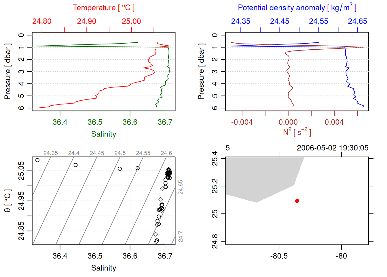 # TODO: Include param here that specifies to handle QC flags. This should be done before converting to a OCE object. QC flag columns are listed in [this spreadsheet](https://docs.google.com/spreadsheets/d/1uCxEmJRqErU-HCQiRQ1FpyiIqtNaGgMSBI0WvrtwBRU/edit?gid=137286311#gid=137286311) and are not supposed to be included in the oce object. QC param values are : # 1 good# 2 +/- 3*std_dev# 4 +/- 5*std_dev# 9 missing# Data column should be set to NA if corresponding QC column has value greater than threshold (recommended threshold is 5*std_dev).# Will need to loop through *_qc columns.# TODO: drop spikes (how? low-pass?).# TODO: combine replicate sensors (eg temp1 temp2).