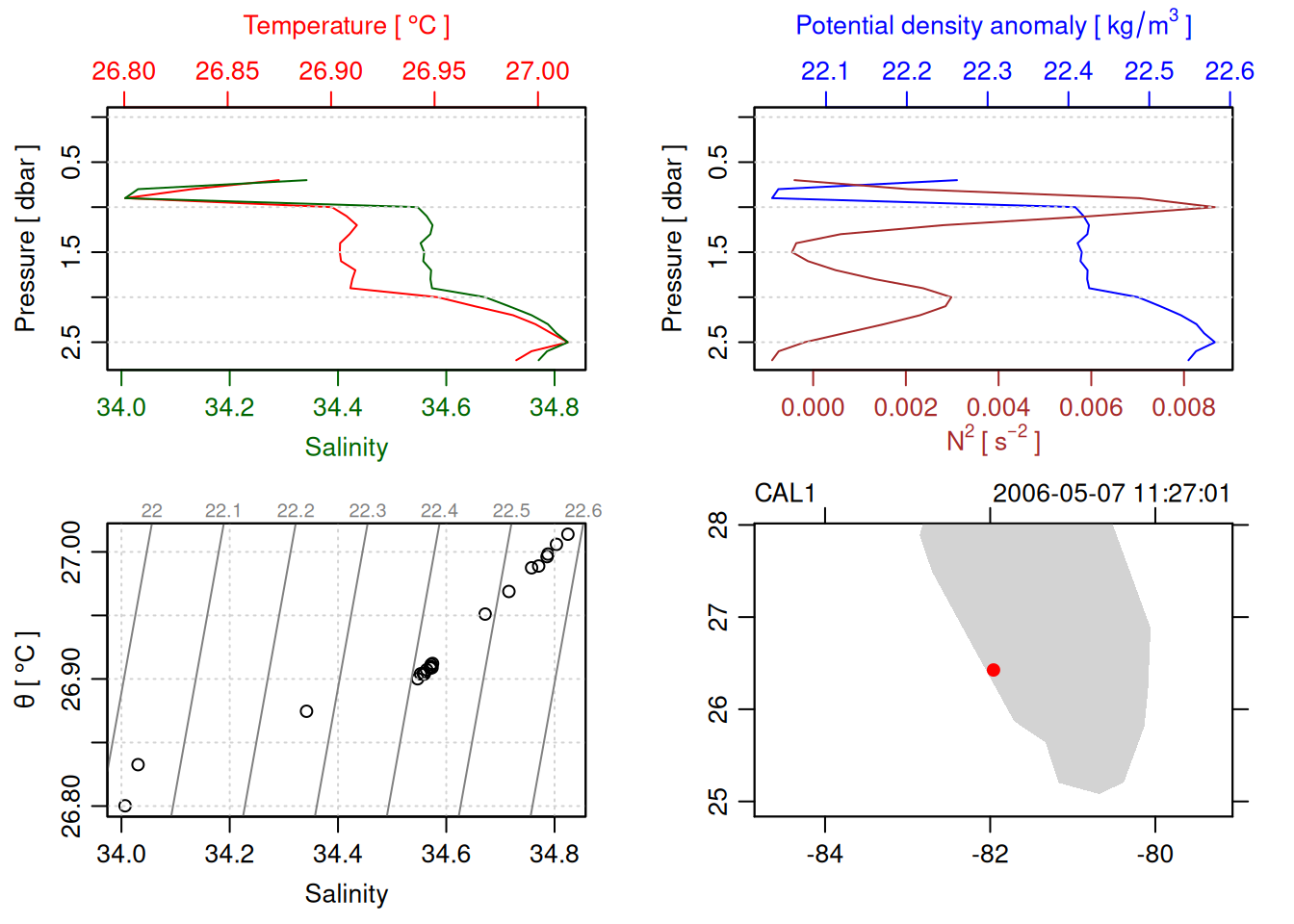 tryCatch({ trimmed_cast <-ctdTrim(cast) decimated_cast <-ctdDecimate(trimmed_cast, p =0.1)# plotting can cause the xlim failureplot(decimated_cast)# === export ===# Get the scan numbers that remain after cleaning cleaned_scans <- decimated_cast@data$scan# Load original raw data to keep all columns ctd_raw <- readr::read_csv(dataFile, show_col_types =FALSE)# Filter raw data to only include the cleaned scans cast_df <- ctd_raw %>%filter(!is.na(sea_water_pressure)) %>%# Remove rows without pressure datamutate(row_num =row_number()) %>%filter(row_num %in% cleaned_scans) %>%select(-row_num)# Add metadata cast_df <-mutate( cast_df,station = station_id,cruise_id = cruise_id )# Check if there are any rows in the cleaned dataif (nrow(cast_df) ==0) {cat("\n=== WARNING: NO DATA AFTER CLEANING ===\n")cat("Cast ID:", params$cast_id, "\n")cat("Station:", station_id, "\n")cat("Cruise:", cruise_id, "\n\n")cat("Raw data rows (with pressure):", sum(!is.na(ctd_raw$sea_water_pressure)), "\n")cat("Cleaned scans to keep:", length(cleaned_scans), "\n")cat("Resulting rows:", nrow(cast_df), "\n\n")cat("Raw data summary:\n")print(summary(ctd_raw[c("sea_water_pressure", "sea_water_temperature", "sea_water_salinity")]))cat("\nCleaned scans (first 20):\n")print(head(cleaned_scans, 20))cat("\n=== CSV FILE NOT CREATED (no data) ===\n\n") } else {# create folder if doesn't exist clean_data_loc <- here::here("data/02_clean")try(fs::dir_create(clean_data_loc))# save ctd to .csv (without row names/indices)write.csv(cast_df, glue("{clean_data_loc}/{params$cast_id}.csv"), row.names =FALSE)cat("Successfully saved", nrow(cast_df), "rows to", glue("{params$cast_id}.csv"), "\n") }}, error =function(e) {cat("\n=== CTD PROCESSING ERROR ===\n")cat("Cast ID:", params$cast_id, "\n")cat("Error message:\n", conditionMessage(e), "\n\n")# Safely inspect objects that might or might not exist when the error happenedif (exists("decimated_cast")) { df <-try(as.data.frame(decimated_cast@data), silent =TRUE)if (!inherits(df, "try-error")) {cat("Dataframe columns:\n")print(names(df))cat("\nSummary of key columns (scan, pressure, temperature, salinity if present):\n") known_cols <-intersect(c("scan", "pressure", "temp", "temperature", "salinity", "conductivity"), names(df))print(summary(df[known_cols], digits =3))cat("\nHead of dataframe:\n")print(head(df)) } else {cat("Could not extract dataframe from decimated_cast.\n") } } else {cat("decimated_cast was never created before the error.\n") }cat("\n=== END ERROR DEBUG INFO ===\n\n")})