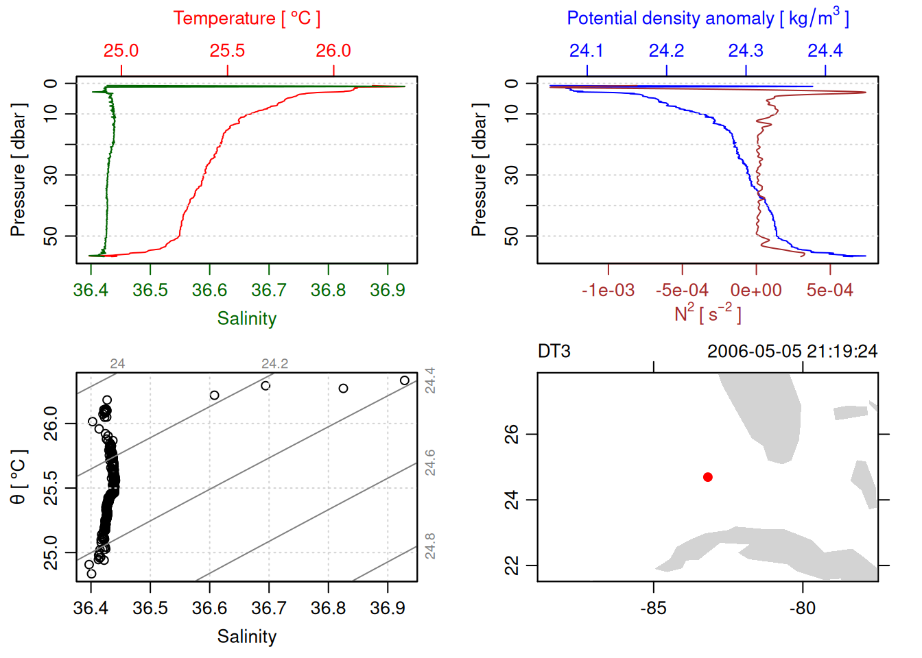 tryCatch({ trimmed_cast <-ctdTrim(cast) decimated_cast <-ctdDecimate(trimmed_cast, p =0.1)# plotting can cause the xlim failureplot(decimated_cast)# === export ===# Get the scan numbers that remain after cleaning cleaned_scans <- decimated_cast@data$scan# Load original raw data to keep all columns ctd_raw <- readr::read_csv(dataFile, show_col_types =FALSE)# Filter raw data to only include the cleaned scans cast_df <- ctd_raw %>%filter(!is.na(sea_water_pressure)) %>%# Remove rows without pressure datamutate(row_num =row_number()) %>%filter(row_num %in% cleaned_scans) %>%select(-row_num)# Add metadata cast_df <-mutate( cast_df,station = station_id,cruise_id = cruise_id )# Check if there are any rows in the cleaned dataif (nrow(cast_df) ==0) {cat("\n=== WARNING: NO DATA AFTER CLEANING ===\n")cat("Cast ID:", params$cast_id, "\n")cat("Station:", station_id, "\n")cat("Cruise:", cruise_id, "\n\n")cat("Raw data rows (with pressure):", sum(!is.na(ctd_raw$sea_water_pressure)), "\n")cat("Cleaned scans to keep:", length(cleaned_scans), "\n")cat("Resulting rows:", nrow(cast_df), "\n\n")cat("Raw data summary:\n")print(summary(ctd_raw[c("sea_water_pressure", "sea_water_temperature", "sea_water_salinity")]))cat("\nCleaned scans (first 20):\n")print(head(cleaned_scans, 20))cat("\n=== CSV FILE NOT CREATED (no data) ===\n\n") } else {# create folder if doesn't exist clean_data_loc <- here::here("data/02_clean")try(fs::dir_create(clean_data_loc))# save ctd to .csv (without row names/indices)write.csv(cast_df, glue("{clean_data_loc}/{params$cast_id}.csv"), row.names =FALSE)cat("Successfully saved", nrow(cast_df), "rows to", glue("{params$cast_id}.csv"), "\n") }}, error =function(e) {cat("\n=== CTD PROCESSING ERROR ===\n")cat("Cast ID:", params$cast_id, "\n")cat("Error message:\n", conditionMessage(e), "\n\n")# Safely inspect objects that might or might not exist when the error happenedif (exists("decimated_cast")) { df <-try(as.data.frame(decimated_cast@data), silent =TRUE)if (!inherits(df, "try-error")) {cat("Dataframe columns:\n")print(names(df))cat("\nSummary of key columns (scan, pressure, temperature, salinity if present):\n") known_cols <-intersect(c("scan", "pressure", "temp", "temperature", "salinity", "conductivity"), names(df))print(summary(df[known_cols], digits =3))cat("\nHead of dataframe:\n")print(head(df)) } else {cat("Could not extract dataframe from decimated_cast.\n") } } else {cat("decimated_cast was never created before the error.\n") }cat("\n=== END ERROR DEBUG INFO ===\n\n")})