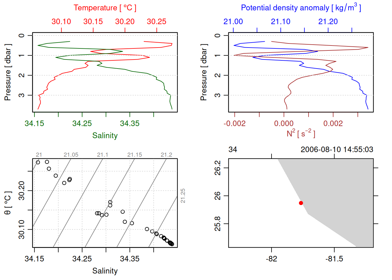 tryCatch({ trimmed_cast <-ctdTrim(cast) decimated_cast <-ctdDecimate(trimmed_cast, p =0.1)# plotting can cause the xlim failureplot(decimated_cast)# === export ===# Get the scan numbers that remain after cleaning cleaned_scans <- decimated_cast@data$scan# Load original raw data to keep all columns ctd_raw <- readr::read_csv(dataFile, show_col_types =FALSE)# Filter raw data to only include the cleaned scans cast_df <- ctd_raw %>%filter(!is.na(sea_water_pressure)) %>%# Remove rows without pressure datamutate(row_num =row_number()) %>%filter(row_num %in% cleaned_scans) %>%select(-row_num)# Add metadata cast_df <-mutate( cast_df,station = station_id,cruise_id = cruise_id )# Check if there are any rows in the cleaned dataif (nrow(cast_df) ==0) {cat("\n=== WARNING: NO DATA AFTER CLEANING ===\n")cat("Cast ID:", params$cast_id, "\n")cat("Station:", station_id, "\n")cat("Cruise:", cruise_id, "\n\n")cat("Raw data rows (with pressure):", sum(!is.na(ctd_raw$sea_water_pressure)), "\n")cat("Cleaned scans to keep:", length(cleaned_scans), "\n")cat("Resulting rows:", nrow(cast_df), "\n\n")cat("Raw data summary:\n")print(summary(ctd_raw[c("sea_water_pressure", "sea_water_temperature", "sea_water_salinity")]))cat("\nCleaned scans (first 20):\n")print(head(cleaned_scans, 20))cat("\n=== CSV FILE NOT CREATED (no data) ===\n\n") } else {# create folder if doesn't exist clean_data_loc <- here::here("data/02_clean")try(fs::dir_create(clean_data_loc))# save ctd to .csv (without row names/indices)write.csv(cast_df, glue("{clean_data_loc}/{params$cast_id}.csv"), row.names =FALSE)cat("Successfully saved", nrow(cast_df), "rows to", glue("{params$cast_id}.csv"), "\n") }}, error =function(e) {cat("\n=== CTD PROCESSING ERROR ===\n")cat("Cast ID:", params$cast_id, "\n")cat("Error message:\n", conditionMessage(e), "\n\n")# Safely inspect objects that might or might not exist when the error happenedif (exists("decimated_cast")) { df <-try(as.data.frame(decimated_cast@data), silent =TRUE)if (!inherits(df, "try-error")) {cat("Dataframe columns:\n")print(names(df))cat("\nSummary of key columns (scan, pressure, temperature, salinity if present):\n") known_cols <-intersect(c("scan", "pressure", "temp", "temperature", "salinity", "conductivity"), names(df))print(summary(df[known_cols], digits =3))cat("\nHead of dataframe:\n")print(head(df)) } else {cat("Could not extract dataframe from decimated_cast.\n") } } else {cat("decimated_cast was never created before the error.\n") }cat("\n=== END ERROR DEBUG INFO ===\n\n")})