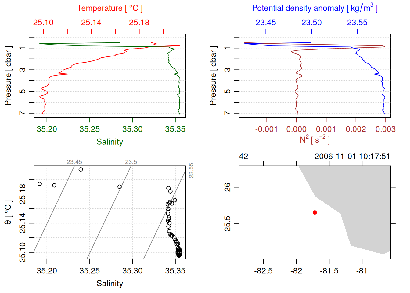 tryCatch({ trimmed_cast <-ctdTrim(cast) decimated_cast <-ctdDecimate(trimmed_cast, p =0.1)# plotting can cause the xlim failureplot(decimated_cast)# === export ===# Get the scan numbers that remain after cleaning cleaned_scans <- decimated_cast@data$scan# Load original raw data to keep all columns ctd_raw <- readr::read_csv(dataFile, show_col_types =FALSE)# Filter raw data to only include the cleaned scans cast_df <- ctd_raw %>%filter(!is.na(sea_water_pressure)) %>%# Remove rows without pressure datamutate(row_num =row_number()) %>%filter(row_num %in% cleaned_scans) %>%select(-row_num)# Add metadata cast_df <-mutate( cast_df,station = station_id,cruise_id = cruise_id )# Check if there are any rows in the cleaned dataif (nrow(cast_df) ==0) {cat("\n=== WARNING: NO DATA AFTER CLEANING ===\n")cat("Cast ID:", params$cast_id, "\n")cat("Station:", station_id, "\n")cat("Cruise:", cruise_id, "\n\n")cat("Raw data rows (with pressure):", sum(!is.na(ctd_raw$sea_water_pressure)), "\n")cat("Cleaned scans to keep:", length(cleaned_scans), "\n")cat("Resulting rows:", nrow(cast_df), "\n\n")cat("Raw data summary:\n")print(summary(ctd_raw[c("sea_water_pressure", "sea_water_temperature", "sea_water_salinity")]))cat("\nCleaned scans (first 20):\n")print(head(cleaned_scans, 20))cat("\n=== CSV FILE NOT CREATED (no data) ===\n\n") } else {# create folder if doesn't exist clean_data_loc <- here::here("data/02_clean")try(fs::dir_create(clean_data_loc))# save ctd to .csv (without row names/indices)write.csv(cast_df, glue("{clean_data_loc}/{params$cast_id}.csv"), row.names =FALSE)cat("Successfully saved", nrow(cast_df), "rows to", glue("{params$cast_id}.csv"), "\n") }}, error =function(e) {cat("\n=== CTD PROCESSING ERROR ===\n")cat("Cast ID:", params$cast_id, "\n")cat("Error message:\n", conditionMessage(e), "\n\n")# Safely inspect objects that might or might not exist when the error happenedif (exists("decimated_cast")) { df <-try(as.data.frame(decimated_cast@data), silent =TRUE)if (!inherits(df, "try-error")) {cat("Dataframe columns:\n")print(names(df))cat("\nSummary of key columns (scan, pressure, temperature, salinity if present):\n") known_cols <-intersect(c("scan", "pressure", "temp", "temperature", "salinity", "conductivity"), names(df))print(summary(df[known_cols], digits =3))cat("\nHead of dataframe:\n")print(head(df)) } else {cat("Could not extract dataframe from decimated_cast.\n") } } else {cat("decimated_cast was never created before the error.\n") }cat("\n=== END ERROR DEBUG INFO ===\n\n")})
