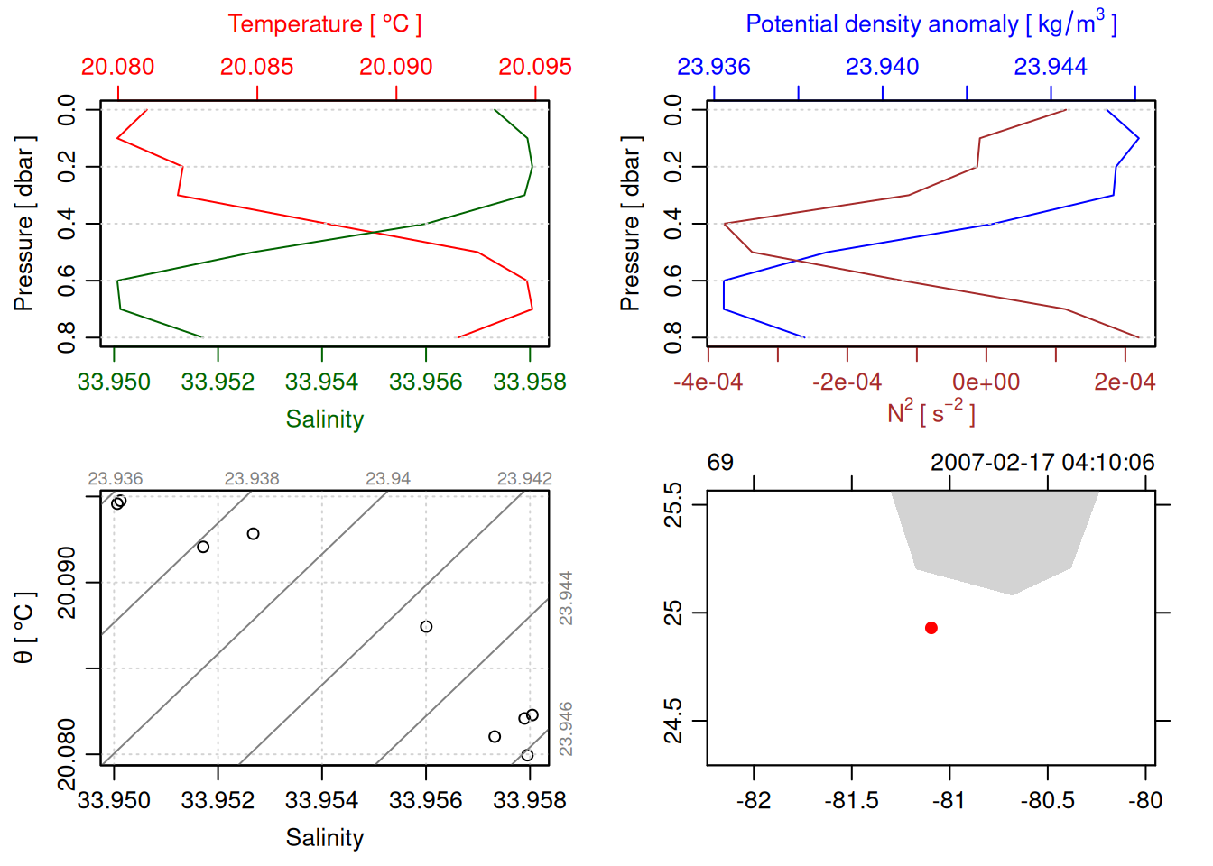 # TODO: Include param here that specifies to handle QC flags. This should be done before converting to a OCE object. QC flag columns are listed in [this spreadsheet](https://docs.google.com/spreadsheets/d/1uCxEmJRqErU-HCQiRQ1FpyiIqtNaGgMSBI0WvrtwBRU/edit?gid=137286311#gid=137286311) and are not supposed to be included in the oce object. QC param values are : # 1 good# 2 +/- 3*std_dev# 4 +/- 5*std_dev# 9 missing# Data column should be set to NA if corresponding QC column has value greater than threshold (recommended threshold is 5*std_dev).# Will need to loop through *_qc columns.# TODO: drop spikes (how? low-pass?).# TODO: combine replicate sensors (eg temp1 temp2).