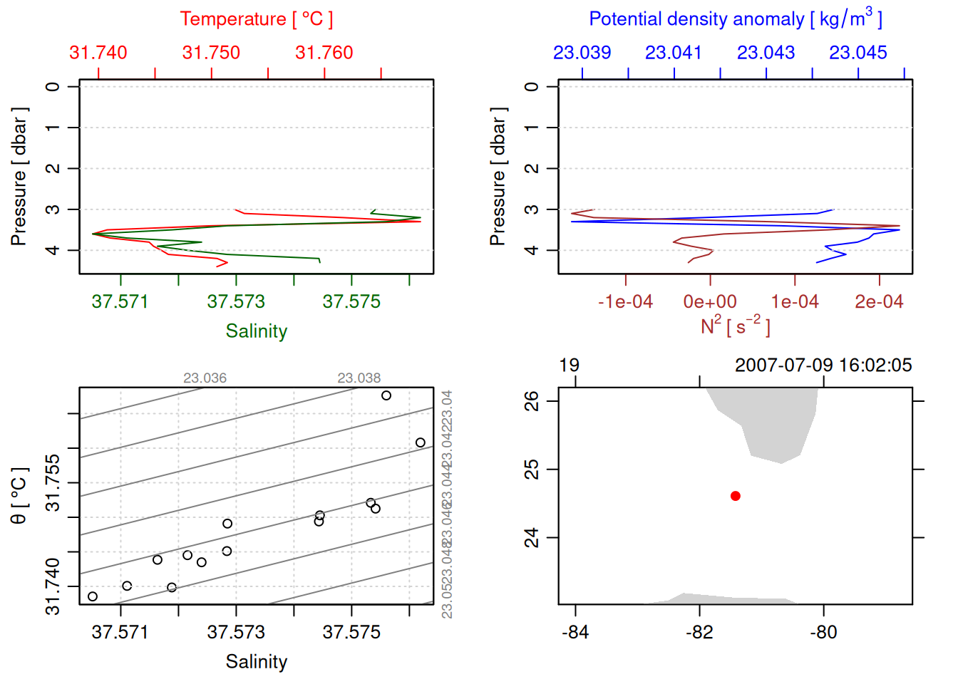 # TODO: Include param here that specifies to handle QC flags. This should be done before converting to a OCE object. QC flag columns are listed in [this spreadsheet](https://docs.google.com/spreadsheets/d/1uCxEmJRqErU-HCQiRQ1FpyiIqtNaGgMSBI0WvrtwBRU/edit?gid=137286311#gid=137286311) and are not supposed to be included in the oce object. QC param values are : # 1 good# 2 +/- 3*std_dev# 4 +/- 5*std_dev# 9 missing# Data column should be set to NA if corresponding QC column has value greater than threshold (recommended threshold is 5*std_dev).# Will need to loop through *_qc columns.# TODO: drop spikes (how? low-pass?).# TODO: combine replicate sensors (eg temp1 temp2).