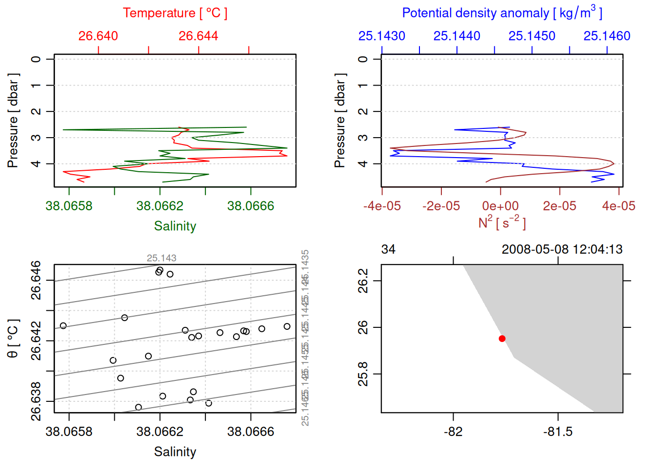 tryCatch({ trimmed_cast <-ctdTrim(cast) decimated_cast <-ctdDecimate(trimmed_cast, p =0.1)# plotting can cause the xlim failureplot(decimated_cast)# === export ===# Get the scan numbers that remain after cleaning cleaned_scans <- decimated_cast@data$scan# Load original raw data to keep all columns ctd_raw <- readr::read_csv(dataFile, show_col_types =FALSE)# Filter raw data to only include the cleaned scans cast_df <- ctd_raw %>%filter(!is.na(sea_water_pressure)) %>%# Remove rows without pressure datamutate(row_num =row_number()) %>%filter(row_num %in% cleaned_scans) %>%select(-row_num)# Add metadata cast_df <-mutate( cast_df,station = station_id,cruise_id = cruise_id )# Check if there are any rows in the cleaned dataif (nrow(cast_df) ==0) {cat("\n=== WARNING: NO DATA AFTER CLEANING ===\n")cat("Cast ID:", params$cast_id, "\n")cat("Station:", station_id, "\n")cat("Cruise:", cruise_id, "\n\n")cat("Raw data rows (with pressure):", sum(!is.na(ctd_raw$sea_water_pressure)), "\n")cat("Cleaned scans to keep:", length(cleaned_scans), "\n")cat("Resulting rows:", nrow(cast_df), "\n\n")cat("Raw data summary:\n")print(summary(ctd_raw[c("sea_water_pressure", "sea_water_temperature", "sea_water_salinity")]))cat("\nCleaned scans (first 20):\n")print(head(cleaned_scans, 20))cat("\n=== CSV FILE NOT CREATED (no data) ===\n\n") } else {# create folder if doesn't exist clean_data_loc <- here::here("data/02_clean")try(fs::dir_create(clean_data_loc))# save ctd to .csv (without row names/indices)write.csv(cast_df, glue("{clean_data_loc}/{params$cast_id}.csv"), row.names =FALSE)cat("Successfully saved", nrow(cast_df), "rows to", glue("{params$cast_id}.csv"), "\n") }}, error =function(e) {cat("\n=== CTD PROCESSING ERROR ===\n")cat("Cast ID:", params$cast_id, "\n")cat("Error message:\n", conditionMessage(e), "\n\n")# Safely inspect objects that might or might not exist when the error happenedif (exists("decimated_cast")) { df <-try(as.data.frame(decimated_cast@data), silent =TRUE)if (!inherits(df, "try-error")) {cat("Dataframe columns:\n")print(names(df))cat("\nSummary of key columns (scan, pressure, temperature, salinity if present):\n") known_cols <-intersect(c("scan", "pressure", "temp", "temperature", "salinity", "conductivity"), names(df))print(summary(df[known_cols], digits =3))cat("\nHead of dataframe:\n")print(head(df)) } else {cat("Could not extract dataframe from decimated_cast.\n") } } else {cat("decimated_cast was never created before the error.\n") }cat("\n=== END ERROR DEBUG INFO ===\n\n")})