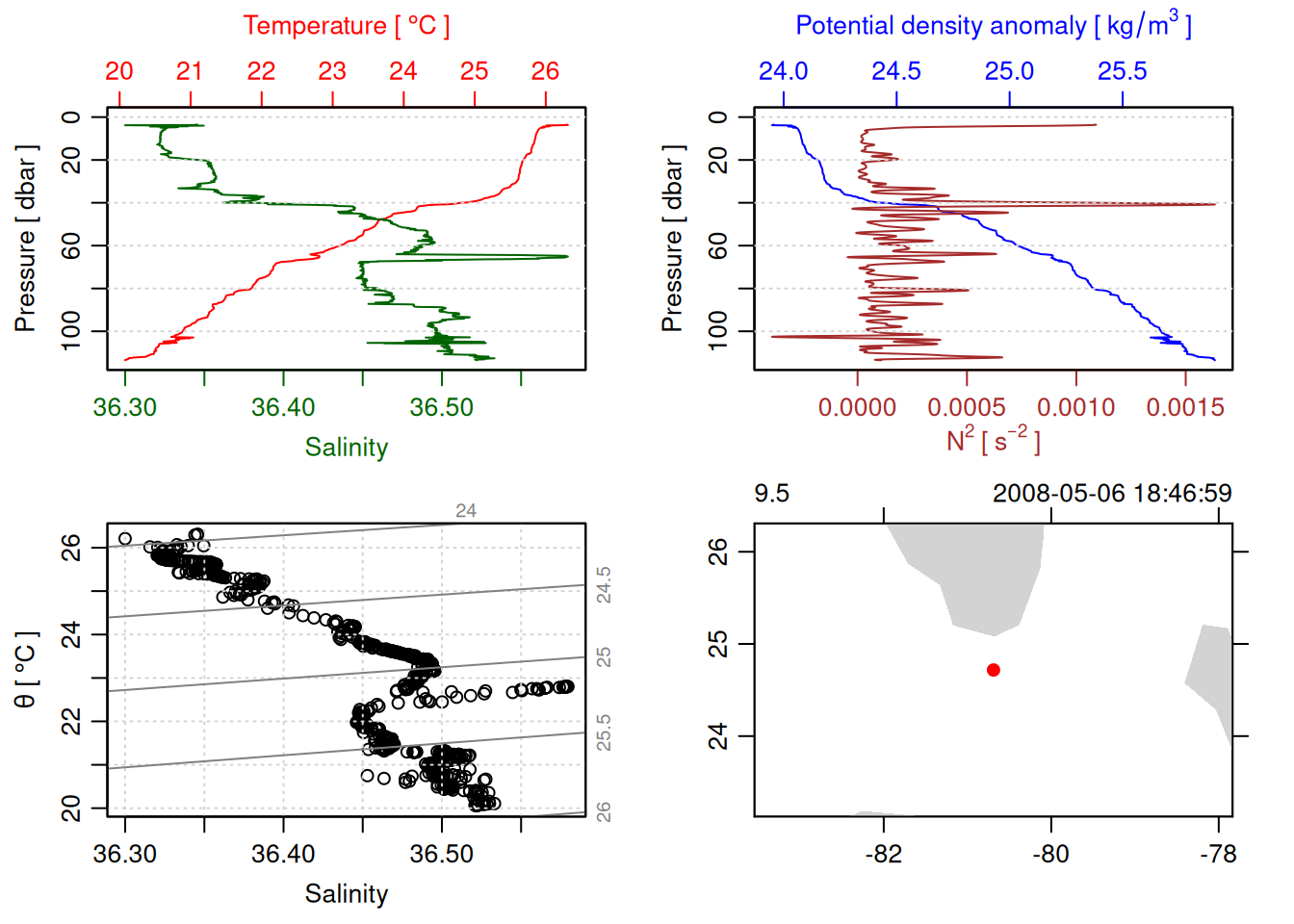 tryCatch({ trimmed_cast <-ctdTrim(cast) decimated_cast <-ctdDecimate(trimmed_cast, p =0.1)# plotting can cause the xlim failureplot(decimated_cast)# === export ===# Get the scan numbers that remain after cleaning cleaned_scans <- decimated_cast@data$scan# Load original raw data to keep all columns ctd_raw <- readr::read_csv(dataFile, show_col_types =FALSE)# Filter raw data to only include the cleaned scans cast_df <- ctd_raw %>%filter(!is.na(sea_water_pressure)) %>%# Remove rows without pressure datamutate(row_num =row_number()) %>%filter(row_num %in% cleaned_scans) %>%select(-row_num)# Add metadata cast_df <-mutate( cast_df,station = station_id,cruise_id = cruise_id )# Check if there are any rows in the cleaned dataif (nrow(cast_df) ==0) {cat("\n=== WARNING: NO DATA AFTER CLEANING ===\n")cat("Cast ID:", params$cast_id, "\n")cat("Station:", station_id, "\n")cat("Cruise:", cruise_id, "\n\n")cat("Raw data rows (with pressure):", sum(!is.na(ctd_raw$sea_water_pressure)), "\n")cat("Cleaned scans to keep:", length(cleaned_scans), "\n")cat("Resulting rows:", nrow(cast_df), "\n\n")cat("Raw data summary:\n")print(summary(ctd_raw[c("sea_water_pressure", "sea_water_temperature", "sea_water_salinity")]))cat("\nCleaned scans (first 20):\n")print(head(cleaned_scans, 20))cat("\n=== CSV FILE NOT CREATED (no data) ===\n\n") } else {# create folder if doesn't exist clean_data_loc <- here::here("data/02_clean")try(fs::dir_create(clean_data_loc))# save ctd to .csv (without row names/indices)write.csv(cast_df, glue("{clean_data_loc}/{params$cast_id}.csv"), row.names =FALSE)cat("Successfully saved", nrow(cast_df), "rows to", glue("{params$cast_id}.csv"), "\n") }}, error =function(e) {cat("\n=== CTD PROCESSING ERROR ===\n")cat("Cast ID:", params$cast_id, "\n")cat("Error message:\n", conditionMessage(e), "\n\n")# Safely inspect objects that might or might not exist when the error happenedif (exists("decimated_cast")) { df <-try(as.data.frame(decimated_cast@data), silent =TRUE)if (!inherits(df, "try-error")) {cat("Dataframe columns:\n")print(names(df))cat("\nSummary of key columns (scan, pressure, temperature, salinity if present):\n") known_cols <-intersect(c("scan", "pressure", "temp", "temperature", "salinity", "conductivity"), names(df))print(summary(df[known_cols], digits =3))cat("\nHead of dataframe:\n")print(head(df)) } else {cat("Could not extract dataframe from decimated_cast.\n") } } else {cat("decimated_cast was never created before the error.\n") }cat("\n=== END ERROR DEBUG INFO ===\n\n")})