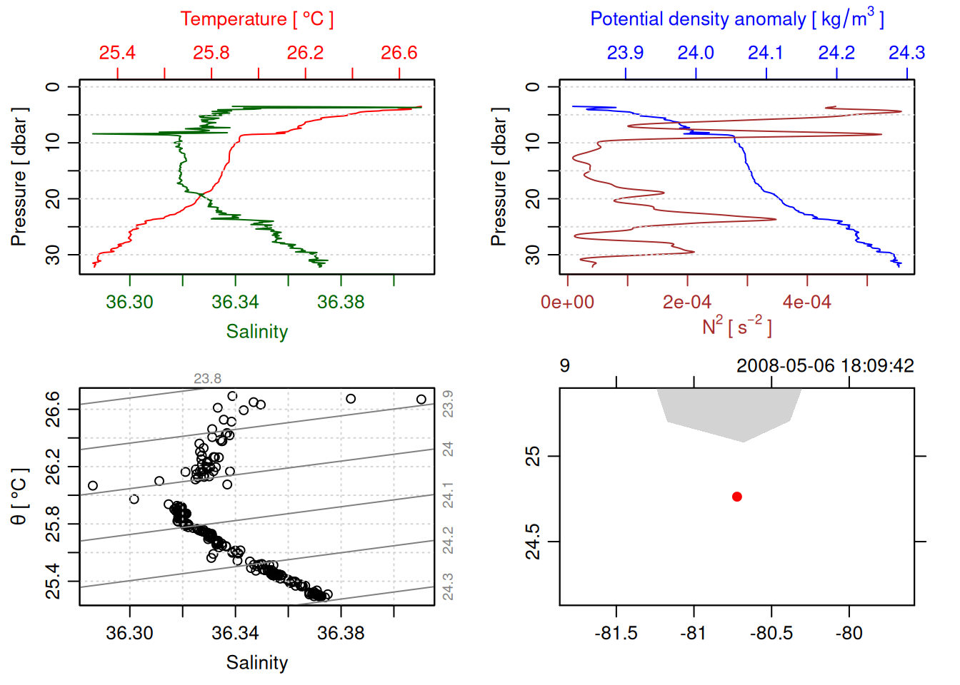 tryCatch({ trimmed_cast <-ctdTrim(cast) decimated_cast <-ctdDecimate(trimmed_cast, p =0.1)# plotting can cause the xlim failureplot(decimated_cast)# === export ===# Get the scan numbers that remain after cleaning cleaned_scans <- decimated_cast@data$scan# Load original raw data to keep all columns ctd_raw <- readr::read_csv(dataFile, show_col_types =FALSE)# Filter raw data to only include the cleaned scans cast_df <- ctd_raw %>%filter(!is.na(sea_water_pressure)) %>%# Remove rows without pressure datamutate(row_num =row_number()) %>%filter(row_num %in% cleaned_scans) %>%select(-row_num)# Add metadata cast_df <-mutate( cast_df,station = station_id,cruise_id = cruise_id )# Check if there are any rows in the cleaned dataif (nrow(cast_df) ==0) {cat("\n=== WARNING: NO DATA AFTER CLEANING ===\n")cat("Cast ID:", params$cast_id, "\n")cat("Station:", station_id, "\n")cat("Cruise:", cruise_id, "\n\n")cat("Raw data rows (with pressure):", sum(!is.na(ctd_raw$sea_water_pressure)), "\n")cat("Cleaned scans to keep:", length(cleaned_scans), "\n")cat("Resulting rows:", nrow(cast_df), "\n\n")cat("Raw data summary:\n")print(summary(ctd_raw[c("sea_water_pressure", "sea_water_temperature", "sea_water_salinity")]))cat("\nCleaned scans (first 20):\n")print(head(cleaned_scans, 20))cat("\n=== CSV FILE NOT CREATED (no data) ===\n\n") } else {# create folder if doesn't exist clean_data_loc <- here::here("data/02_clean")try(fs::dir_create(clean_data_loc))# save ctd to .csv (without row names/indices)write.csv(cast_df, glue("{clean_data_loc}/{params$cast_id}.csv"), row.names =FALSE)cat("Successfully saved", nrow(cast_df), "rows to", glue("{params$cast_id}.csv"), "\n") }}, error =function(e) {cat("\n=== CTD PROCESSING ERROR ===\n")cat("Cast ID:", params$cast_id, "\n")cat("Error message:\n", conditionMessage(e), "\n\n")# Safely inspect objects that might or might not exist when the error happenedif (exists("decimated_cast")) { df <-try(as.data.frame(decimated_cast@data), silent =TRUE)if (!inherits(df, "try-error")) {cat("Dataframe columns:\n")print(names(df))cat("\nSummary of key columns (scan, pressure, temperature, salinity if present):\n") known_cols <-intersect(c("scan", "pressure", "temp", "temperature", "salinity", "conductivity"), names(df))print(summary(df[known_cols], digits =3))cat("\nHead of dataframe:\n")print(head(df)) } else {cat("Could not extract dataframe from decimated_cast.\n") } } else {cat("decimated_cast was never created before the error.\n") }cat("\n=== END ERROR DEBUG INFO ===\n\n")})