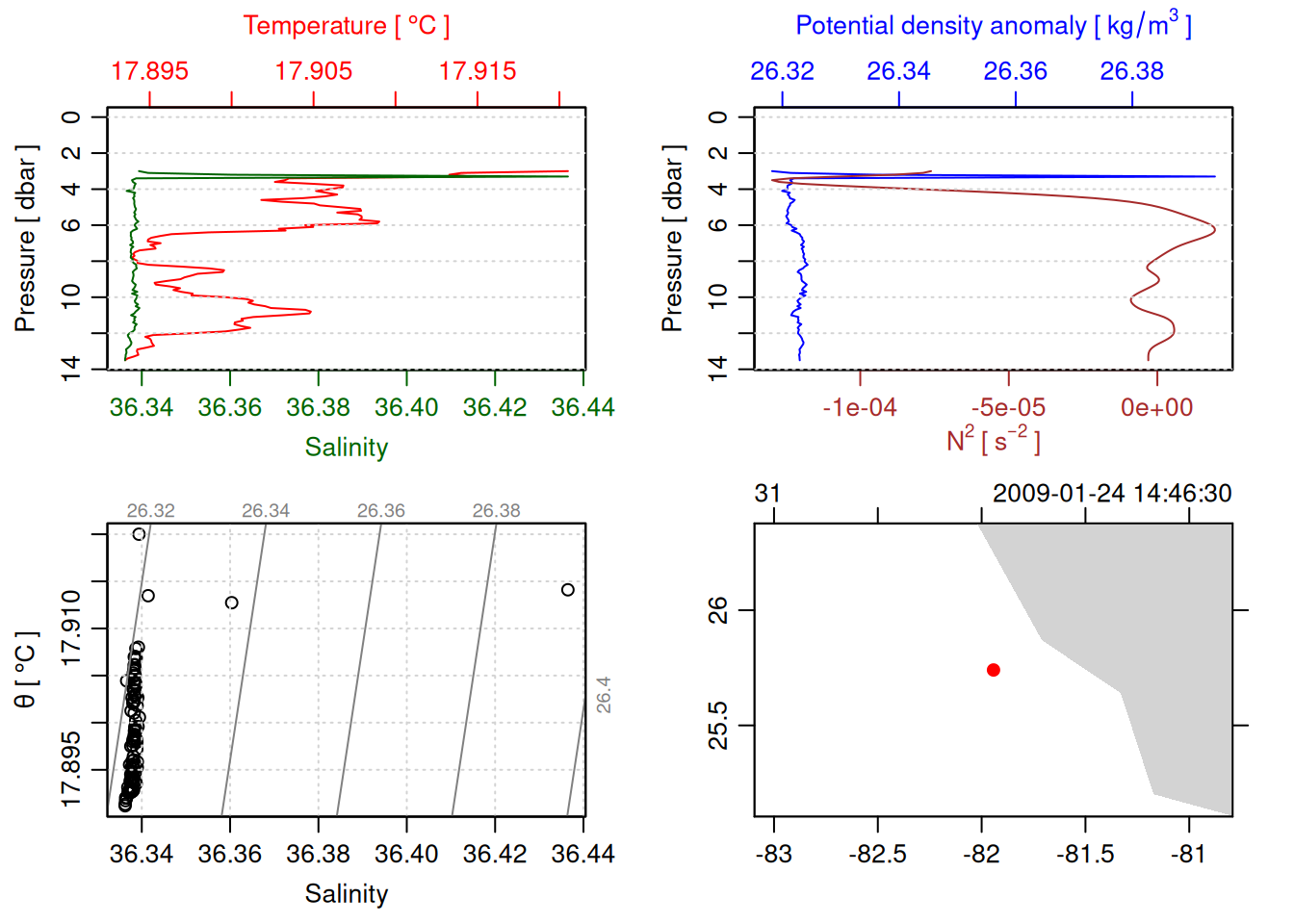 tryCatch({ trimmed_cast <-ctdTrim(cast) decimated_cast <-ctdDecimate(trimmed_cast, p =0.1)# plotting can cause the xlim failureplot(decimated_cast)# === export ===# Get the scan numbers that remain after cleaning cleaned_scans <- decimated_cast@data$scan# Load original raw data to keep all columns ctd_raw <- readr::read_csv(dataFile, show_col_types =FALSE)# Filter raw data to only include the cleaned scans cast_df <- ctd_raw %>%filter(!is.na(sea_water_pressure)) %>%# Remove rows without pressure datamutate(row_num =row_number()) %>%filter(row_num %in% cleaned_scans) %>%select(-row_num)# Add metadata cast_df <-mutate( cast_df,station = station_id,cruise_id = cruise_id )# Check if there are any rows in the cleaned dataif (nrow(cast_df) ==0) {cat("\n=== WARNING: NO DATA AFTER CLEANING ===\n")cat("Cast ID:", params$cast_id, "\n")cat("Station:", station_id, "\n")cat("Cruise:", cruise_id, "\n\n")cat("Raw data rows (with pressure):", sum(!is.na(ctd_raw$sea_water_pressure)), "\n")cat("Cleaned scans to keep:", length(cleaned_scans), "\n")cat("Resulting rows:", nrow(cast_df), "\n\n")cat("Raw data summary:\n")print(summary(ctd_raw[c("sea_water_pressure", "sea_water_temperature", "sea_water_salinity")]))cat("\nCleaned scans (first 20):\n")print(head(cleaned_scans, 20))cat("\n=== CSV FILE NOT CREATED (no data) ===\n\n") } else {# create folder if doesn't exist clean_data_loc <- here::here("data/02_clean")try(fs::dir_create(clean_data_loc))# save ctd to .csv (without row names/indices)write.csv(cast_df, glue("{clean_data_loc}/{params$cast_id}.csv"), row.names =FALSE)cat("Successfully saved", nrow(cast_df), "rows to", glue("{params$cast_id}.csv"), "\n") }}, error =function(e) {cat("\n=== CTD PROCESSING ERROR ===\n")cat("Cast ID:", params$cast_id, "\n")cat("Error message:\n", conditionMessage(e), "\n\n")# Safely inspect objects that might or might not exist when the error happenedif (exists("decimated_cast")) { df <-try(as.data.frame(decimated_cast@data), silent =TRUE)if (!inherits(df, "try-error")) {cat("Dataframe columns:\n")print(names(df))cat("\nSummary of key columns (scan, pressure, temperature, salinity if present):\n") known_cols <-intersect(c("scan", "pressure", "temp", "temperature", "salinity", "conductivity"), names(df))print(summary(df[known_cols], digits =3))cat("\nHead of dataframe:\n")print(head(df)) } else {cat("Could not extract dataframe from decimated_cast.\n") } } else {cat("decimated_cast was never created before the error.\n") }cat("\n=== END ERROR DEBUG INFO ===\n\n")})
