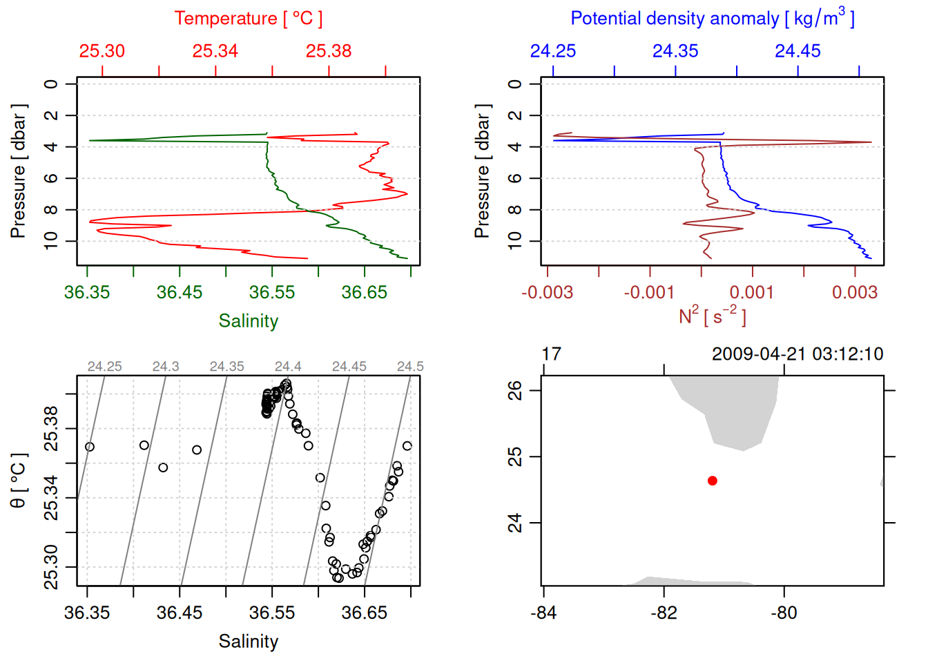 tryCatch({ trimmed_cast <-ctdTrim(cast) decimated_cast <-ctdDecimate(trimmed_cast, p =0.1)# plotting can cause the xlim failureplot(decimated_cast)# === export ===# Get the scan numbers that remain after cleaning cleaned_scans <- decimated_cast@data$scan# Load original raw data to keep all columns ctd_raw <- readr::read_csv(dataFile, show_col_types =FALSE)# Filter raw data to only include the cleaned scans cast_df <- ctd_raw %>%filter(!is.na(sea_water_pressure)) %>%# Remove rows without pressure datamutate(row_num =row_number()) %>%filter(row_num %in% cleaned_scans) %>%select(-row_num)# Add metadata cast_df <-mutate( cast_df,station = station_id,cruise_id = cruise_id )# Check if there are any rows in the cleaned dataif (nrow(cast_df) ==0) {cat("\n=== WARNING: NO DATA AFTER CLEANING ===\n")cat("Cast ID:", params$cast_id, "\n")cat("Station:", station_id, "\n")cat("Cruise:", cruise_id, "\n\n")cat("Raw data rows (with pressure):", sum(!is.na(ctd_raw$sea_water_pressure)), "\n")cat("Cleaned scans to keep:", length(cleaned_scans), "\n")cat("Resulting rows:", nrow(cast_df), "\n\n")cat("Raw data summary:\n")print(summary(ctd_raw[c("sea_water_pressure", "sea_water_temperature", "sea_water_salinity")]))cat("\nCleaned scans (first 20):\n")print(head(cleaned_scans, 20))cat("\n=== CSV FILE NOT CREATED (no data) ===\n\n") } else {# create folder if doesn't exist clean_data_loc <- here::here("data/02_clean")try(fs::dir_create(clean_data_loc))# save ctd to .csv (without row names/indices)write.csv(cast_df, glue("{clean_data_loc}/{params$cast_id}.csv"), row.names =FALSE)cat("Successfully saved", nrow(cast_df), "rows to", glue("{params$cast_id}.csv"), "\n") }}, error =function(e) {cat("\n=== CTD PROCESSING ERROR ===\n")cat("Cast ID:", params$cast_id, "\n")cat("Error message:\n", conditionMessage(e), "\n\n")# Safely inspect objects that might or might not exist when the error happenedif (exists("decimated_cast")) { df <-try(as.data.frame(decimated_cast@data), silent =TRUE)if (!inherits(df, "try-error")) {cat("Dataframe columns:\n")print(names(df))cat("\nSummary of key columns (scan, pressure, temperature, salinity if present):\n") known_cols <-intersect(c("scan", "pressure", "temp", "temperature", "salinity", "conductivity"), names(df))print(summary(df[known_cols], digits =3))cat("\nHead of dataframe:\n")print(head(df)) } else {cat("Could not extract dataframe from decimated_cast.\n") } } else {cat("decimated_cast was never created before the error.\n") }cat("\n=== END ERROR DEBUG INFO ===\n\n")})