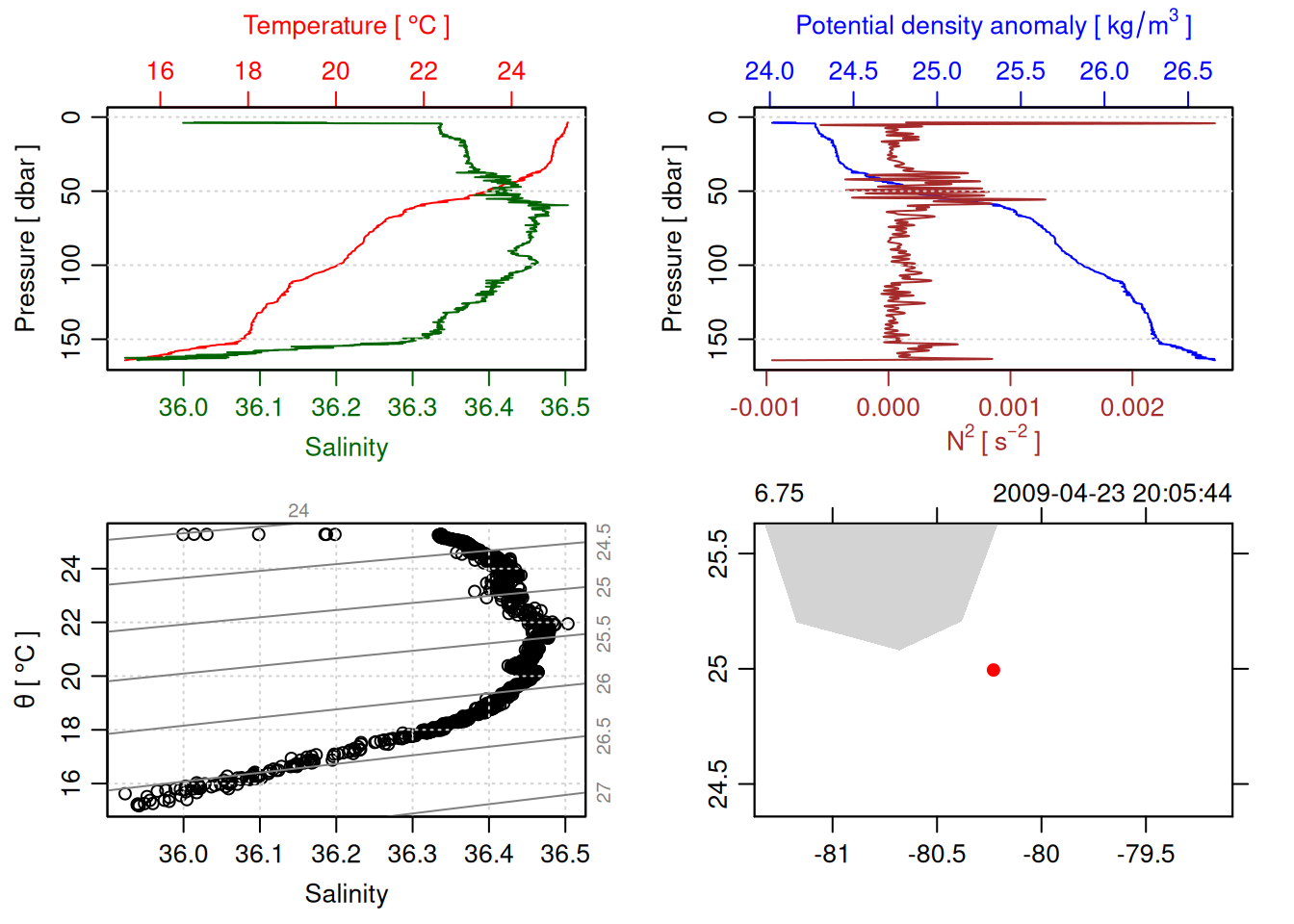 tryCatch({ trimmed_cast <-ctdTrim(cast) decimated_cast <-ctdDecimate(trimmed_cast, p =0.1)# plotting can cause the xlim failureplot(decimated_cast)# === export ===# Get the scan numbers that remain after cleaning cleaned_scans <- decimated_cast@data$scan# Load original raw data to keep all columns ctd_raw <- readr::read_csv(dataFile, show_col_types =FALSE)# Filter raw data to only include the cleaned scans cast_df <- ctd_raw %>%filter(!is.na(sea_water_pressure)) %>%# Remove rows without pressure datamutate(row_num =row_number()) %>%filter(row_num %in% cleaned_scans) %>%select(-row_num)# Add metadata cast_df <-mutate( cast_df,station = station_id,cruise_id = cruise_id )# Check if there are any rows in the cleaned dataif (nrow(cast_df) ==0) {cat("\n=== WARNING: NO DATA AFTER CLEANING ===\n")cat("Cast ID:", params$cast_id, "\n")cat("Station:", station_id, "\n")cat("Cruise:", cruise_id, "\n\n")cat("Raw data rows (with pressure):", sum(!is.na(ctd_raw$sea_water_pressure)), "\n")cat("Cleaned scans to keep:", length(cleaned_scans), "\n")cat("Resulting rows:", nrow(cast_df), "\n\n")cat("Raw data summary:\n")print(summary(ctd_raw[c("sea_water_pressure", "sea_water_temperature", "sea_water_salinity")]))cat("\nCleaned scans (first 20):\n")print(head(cleaned_scans, 20))cat("\n=== CSV FILE NOT CREATED (no data) ===\n\n") } else {# create folder if doesn't exist clean_data_loc <- here::here("data/02_clean")try(fs::dir_create(clean_data_loc))# save ctd to .csv (without row names/indices)write.csv(cast_df, glue("{clean_data_loc}/{params$cast_id}.csv"), row.names =FALSE)cat("Successfully saved", nrow(cast_df), "rows to", glue("{params$cast_id}.csv"), "\n") }}, error =function(e) {cat("\n=== CTD PROCESSING ERROR ===\n")cat("Cast ID:", params$cast_id, "\n")cat("Error message:\n", conditionMessage(e), "\n\n")# Safely inspect objects that might or might not exist when the error happenedif (exists("decimated_cast")) { df <-try(as.data.frame(decimated_cast@data), silent =TRUE)if (!inherits(df, "try-error")) {cat("Dataframe columns:\n")print(names(df))cat("\nSummary of key columns (scan, pressure, temperature, salinity if present):\n") known_cols <-intersect(c("scan", "pressure", "temp", "temperature", "salinity", "conductivity"), names(df))print(summary(df[known_cols], digits =3))cat("\nHead of dataframe:\n")print(head(df)) } else {cat("Could not extract dataframe from decimated_cast.\n") } } else {cat("decimated_cast was never created before the error.\n") }cat("\n=== END ERROR DEBUG INFO ===\n\n")})