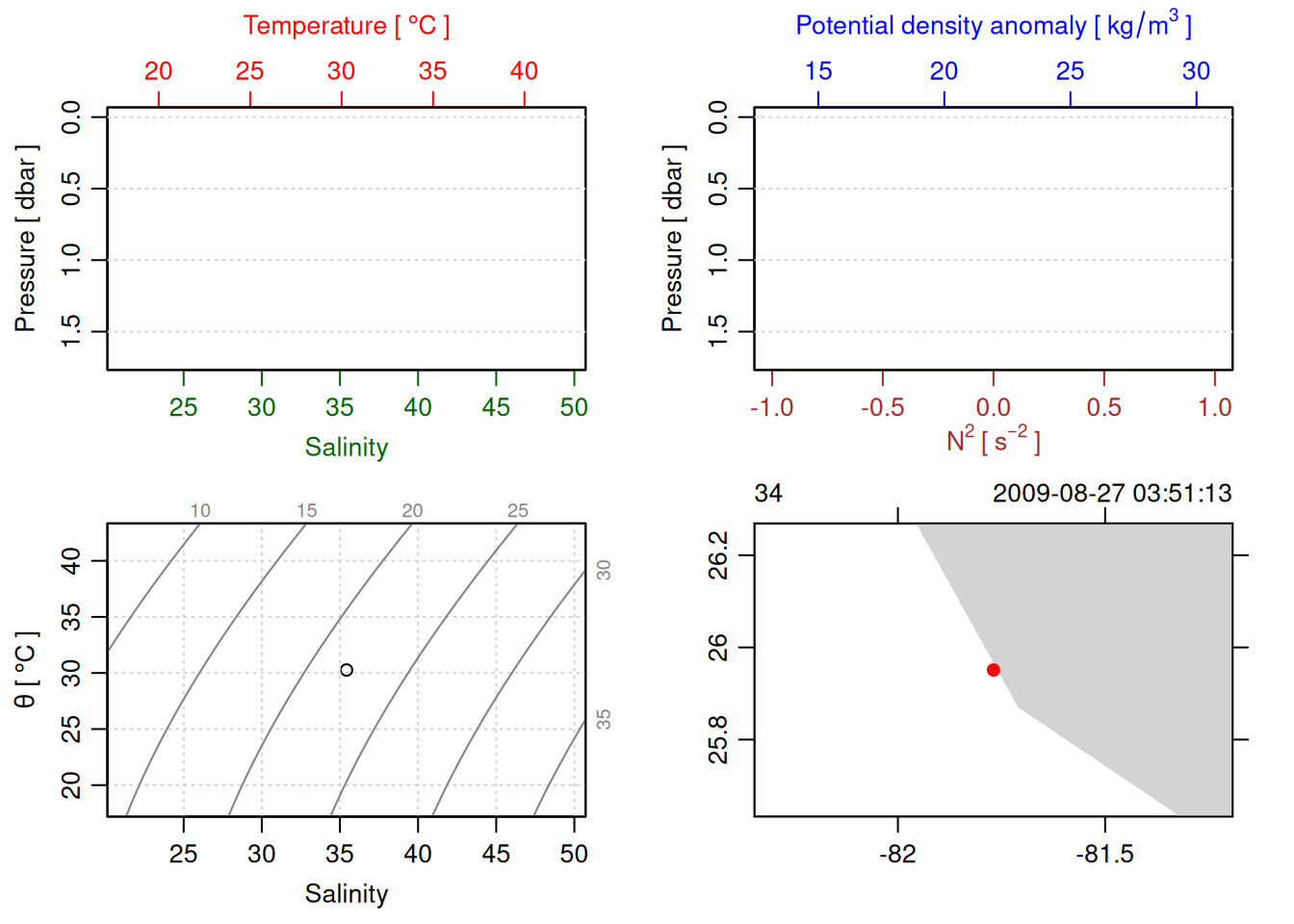 tryCatch({ trimmed_cast <-ctdTrim(cast) decimated_cast <-ctdDecimate(trimmed_cast, p =0.1)# plotting can cause the xlim failureplot(decimated_cast)# === export ===# Get the scan numbers that remain after cleaning cleaned_scans <- decimated_cast@data$scan# Load original raw data to keep all columns ctd_raw <- readr::read_csv(dataFile, show_col_types =FALSE)# Filter raw data to only include the cleaned scans cast_df <- ctd_raw %>%filter(!is.na(sea_water_pressure)) %>%# Remove rows without pressure datamutate(row_num =row_number()) %>%filter(row_num %in% cleaned_scans) %>%select(-row_num)# Add metadata cast_df <-mutate( cast_df,station = station_id,cruise_id = cruise_id )# Check if there are any rows in the cleaned dataif (nrow(cast_df) ==0) {cat("\n=== WARNING: NO DATA AFTER CLEANING ===\n")cat("Cast ID:", params$cast_id, "\n")cat("Station:", station_id, "\n")cat("Cruise:", cruise_id, "\n\n")cat("Raw data rows (with pressure):", sum(!is.na(ctd_raw$sea_water_pressure)), "\n")cat("Cleaned scans to keep:", length(cleaned_scans), "\n")cat("Resulting rows:", nrow(cast_df), "\n\n")cat("Raw data summary:\n")print(summary(ctd_raw[c("sea_water_pressure", "sea_water_temperature", "sea_water_salinity")]))cat("\nCleaned scans (first 20):\n")print(head(cleaned_scans, 20))cat("\n=== CSV FILE NOT CREATED (no data) ===\n\n") } else {# create folder if doesn't exist clean_data_loc <- here::here("data/02_clean")try(fs::dir_create(clean_data_loc))# save ctd to .csv (without row names/indices)write.csv(cast_df, glue("{clean_data_loc}/{params$cast_id}.csv"), row.names =FALSE)cat("Successfully saved", nrow(cast_df), "rows to", glue("{params$cast_id}.csv"), "\n") }}, error =function(e) {cat("\n=== CTD PROCESSING ERROR ===\n")cat("Cast ID:", params$cast_id, "\n")cat("Error message:\n", conditionMessage(e), "\n\n")# Safely inspect objects that might or might not exist when the error happenedif (exists("decimated_cast")) { df <-try(as.data.frame(decimated_cast@data), silent =TRUE)if (!inherits(df, "try-error")) {cat("Dataframe columns:\n")print(names(df))cat("\nSummary of key columns (scan, pressure, temperature, salinity if present):\n") known_cols <-intersect(c("scan", "pressure", "temp", "temperature", "salinity", "conductivity"), names(df))print(summary(df[known_cols], digits =3))cat("\nHead of dataframe:\n")print(head(df)) } else {cat("Could not extract dataframe from decimated_cast.\n") } } else {cat("decimated_cast was never created before the error.\n") }cat("\n=== END ERROR DEBUG INFO ===\n\n")})