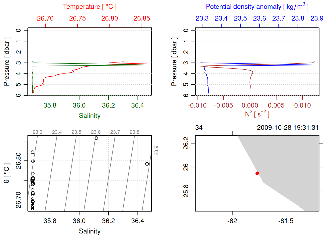 tryCatch({ trimmed_cast <-ctdTrim(cast) decimated_cast <-ctdDecimate(trimmed_cast, p =0.1)# plotting can cause the xlim failureplot(decimated_cast)# === export ===# Get the scan numbers that remain after cleaning cleaned_scans <- decimated_cast@data$scan# Load original raw data to keep all columns ctd_raw <- readr::read_csv(dataFile, show_col_types =FALSE)# Filter raw data to only include the cleaned scans cast_df <- ctd_raw %>%filter(!is.na(sea_water_pressure)) %>%# Remove rows without pressure datamutate(row_num =row_number()) %>%filter(row_num %in% cleaned_scans) %>%select(-row_num)# Add metadata cast_df <-mutate( cast_df,station = station_id,cruise_id = cruise_id )# Check if there are any rows in the cleaned dataif (nrow(cast_df) ==0) {cat("\n=== WARNING: NO DATA AFTER CLEANING ===\n")cat("Cast ID:", params$cast_id, "\n")cat("Station:", station_id, "\n")cat("Cruise:", cruise_id, "\n\n")cat("Raw data rows (with pressure):", sum(!is.na(ctd_raw$sea_water_pressure)), "\n")cat("Cleaned scans to keep:", length(cleaned_scans), "\n")cat("Resulting rows:", nrow(cast_df), "\n\n")cat("Raw data summary:\n")print(summary(ctd_raw[c("sea_water_pressure", "sea_water_temperature", "sea_water_salinity")]))cat("\nCleaned scans (first 20):\n")print(head(cleaned_scans, 20))cat("\n=== CSV FILE NOT CREATED (no data) ===\n\n") } else {# create folder if doesn't exist clean_data_loc <- here::here("data/02_clean")try(fs::dir_create(clean_data_loc))# save ctd to .csv (without row names/indices)write.csv(cast_df, glue("{clean_data_loc}/{params$cast_id}.csv"), row.names =FALSE)cat("Successfully saved", nrow(cast_df), "rows to", glue("{params$cast_id}.csv"), "\n") }}, error =function(e) {cat("\n=== CTD PROCESSING ERROR ===\n")cat("Cast ID:", params$cast_id, "\n")cat("Error message:\n", conditionMessage(e), "\n\n")# Safely inspect objects that might or might not exist when the error happenedif (exists("decimated_cast")) { df <-try(as.data.frame(decimated_cast@data), silent =TRUE)if (!inherits(df, "try-error")) {cat("Dataframe columns:\n")print(names(df))cat("\nSummary of key columns (scan, pressure, temperature, salinity if present):\n") known_cols <-intersect(c("scan", "pressure", "temp", "temperature", "salinity", "conductivity"), names(df))print(summary(df[known_cols], digits =3))cat("\nHead of dataframe:\n")print(head(df)) } else {cat("Could not extract dataframe from decimated_cast.\n") } } else {cat("decimated_cast was never created before the error.\n") }cat("\n=== END ERROR DEBUG INFO ===\n\n")})