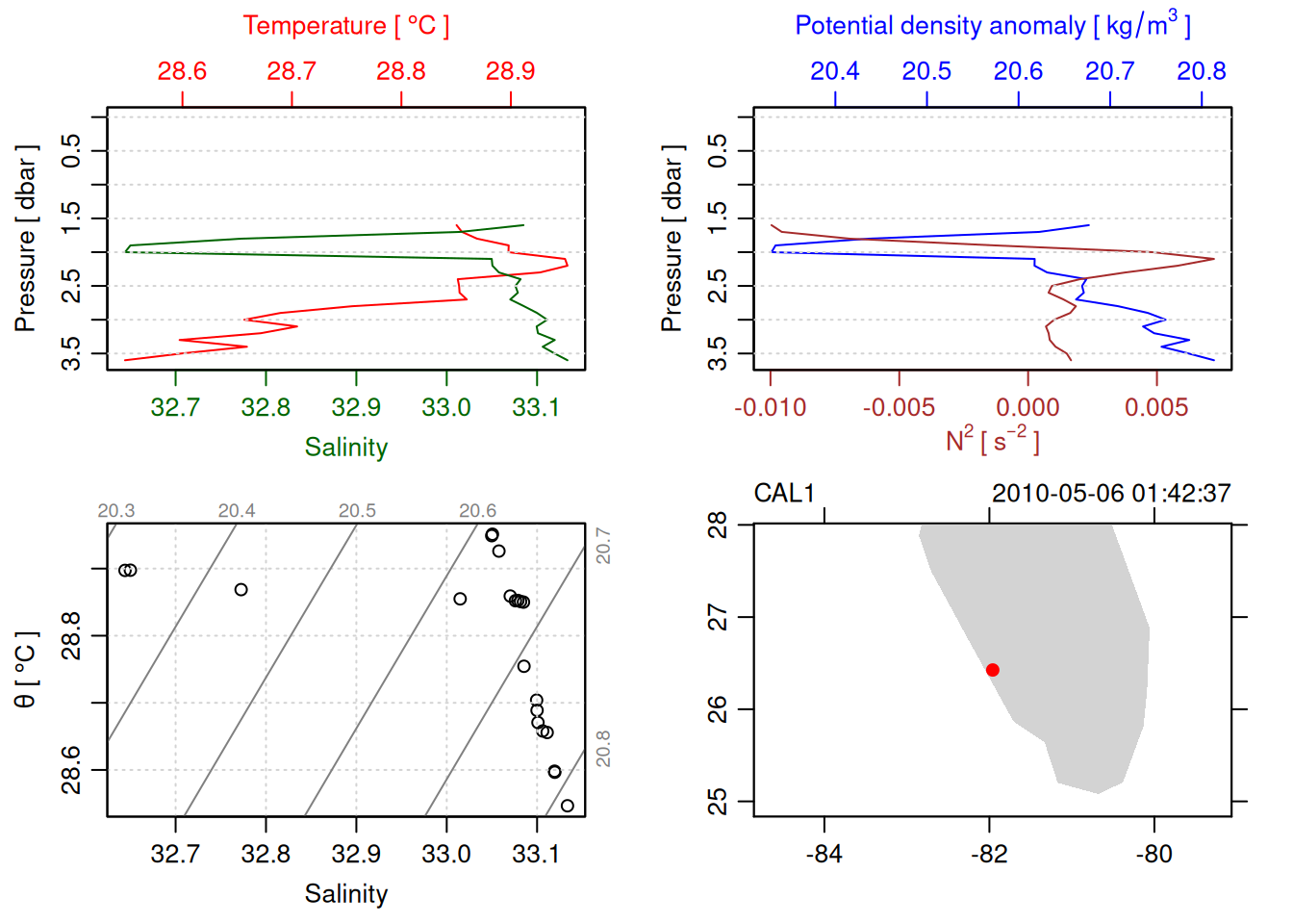 # TODO: Include param here that specifies to handle QC flags. This should be done before converting to a OCE object. QC flag columns are listed in [this spreadsheet](https://docs.google.com/spreadsheets/d/1uCxEmJRqErU-HCQiRQ1FpyiIqtNaGgMSBI0WvrtwBRU/edit?gid=137286311#gid=137286311) and are not supposed to be included in the oce object. QC param values are : # 1 good# 2 +/- 3*std_dev# 4 +/- 5*std_dev# 9 missing# Data column should be set to NA if corresponding QC column has value greater than threshold (recommended threshold is 5*std_dev).# Will need to loop through *_qc columns.# TODO: drop spikes (how? low-pass?).# TODO: combine replicate sensors (eg temp1 temp2).