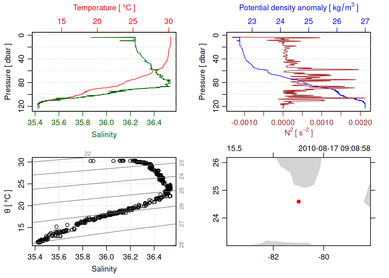 # TODO: Include param here that specifies to handle QC flags. This should be done before converting to a OCE object. QC flag columns are listed in [this spreadsheet](https://docs.google.com/spreadsheets/d/1uCxEmJRqErU-HCQiRQ1FpyiIqtNaGgMSBI0WvrtwBRU/edit?gid=137286311#gid=137286311) and are not supposed to be included in the oce object. QC param values are : # 1 good# 2 +/- 3*std_dev# 4 +/- 5*std_dev# 9 missing# Data column should be set to NA if corresponding QC column has value greater than threshold (recommended threshold is 5*std_dev).# Will need to loop through *_qc columns.# TODO: drop spikes (how? low-pass?).# TODO: combine replicate sensors (eg temp1 temp2).