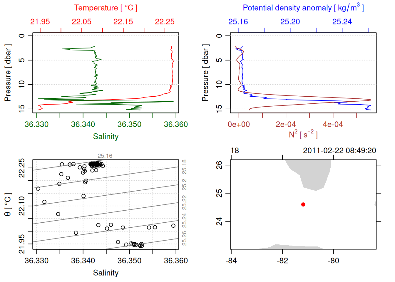 # TODO: Include param here that specifies to handle QC flags. This should be done before converting to a OCE object. QC flag columns are listed in [this spreadsheet](https://docs.google.com/spreadsheets/d/1uCxEmJRqErU-HCQiRQ1FpyiIqtNaGgMSBI0WvrtwBRU/edit?gid=137286311#gid=137286311) and are not supposed to be included in the oce object. QC param values are : # 1 good# 2 +/- 3*std_dev# 4 +/- 5*std_dev# 9 missing# Data column should be set to NA if corresponding QC column has value greater than threshold (recommended threshold is 5*std_dev).# Will need to loop through *_qc columns.# TODO: drop spikes (how? low-pass?).# TODO: combine replicate sensors (eg temp1 temp2).
