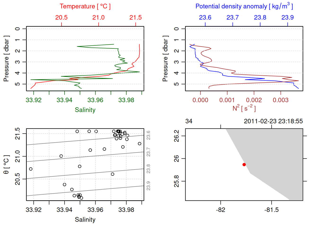 # TODO: Include param here that specifies to handle QC flags. This should be done before converting to a OCE object. QC flag columns are listed in [this spreadsheet](https://docs.google.com/spreadsheets/d/1uCxEmJRqErU-HCQiRQ1FpyiIqtNaGgMSBI0WvrtwBRU/edit?gid=137286311#gid=137286311) and are not supposed to be included in the oce object. QC param values are : # 1 good# 2 +/- 3*std_dev# 4 +/- 5*std_dev# 9 missing# Data column should be set to NA if corresponding QC column has value greater than threshold (recommended threshold is 5*std_dev).# Will need to loop through *_qc columns.# TODO: drop spikes (how? low-pass?).# TODO: combine replicate sensors (eg temp1 temp2).