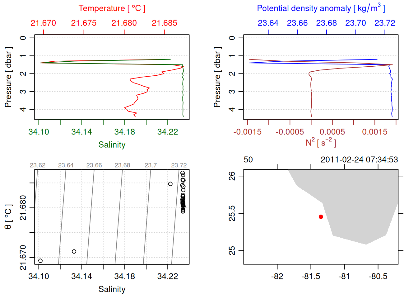 tryCatch({ trimmed_cast <-ctdTrim(cast) decimated_cast <-ctdDecimate(trimmed_cast, p =0.1)# plotting can cause the xlim failureplot(decimated_cast)# === export ===# Get the scan numbers that remain after cleaning cleaned_scans <- decimated_cast@data$scan# Load original raw data to keep all columns ctd_raw <- readr::read_csv(dataFile, show_col_types =FALSE)# Filter raw data to only include the cleaned scans cast_df <- ctd_raw %>%filter(!is.na(sea_water_pressure)) %>%# Remove rows without pressure datamutate(row_num =row_number()) %>%filter(row_num %in% cleaned_scans) %>%select(-row_num)# Add metadata cast_df <-mutate( cast_df,station = station_id,cruise_id = cruise_id )# Check if there are any rows in the cleaned dataif (nrow(cast_df) ==0) {cat("\n=== WARNING: NO DATA AFTER CLEANING ===\n")cat("Cast ID:", params$cast_id, "\n")cat("Station:", station_id, "\n")cat("Cruise:", cruise_id, "\n\n")cat("Raw data rows (with pressure):", sum(!is.na(ctd_raw$sea_water_pressure)), "\n")cat("Cleaned scans to keep:", length(cleaned_scans), "\n")cat("Resulting rows:", nrow(cast_df), "\n\n")cat("Raw data summary:\n")print(summary(ctd_raw[c("sea_water_pressure", "sea_water_temperature", "sea_water_salinity")]))cat("\nCleaned scans (first 20):\n")print(head(cleaned_scans, 20))cat("\n=== CSV FILE NOT CREATED (no data) ===\n\n") } else {# create folder if doesn't exist clean_data_loc <- here::here("data/02_clean")try(fs::dir_create(clean_data_loc))# save ctd to .csv (without row names/indices)write.csv(cast_df, glue("{clean_data_loc}/{params$cast_id}.csv"), row.names =FALSE)cat("Successfully saved", nrow(cast_df), "rows to", glue("{params$cast_id}.csv"), "\n") }}, error =function(e) {cat("\n=== CTD PROCESSING ERROR ===\n")cat("Cast ID:", params$cast_id, "\n")cat("Error message:\n", conditionMessage(e), "\n\n")# Safely inspect objects that might or might not exist when the error happenedif (exists("decimated_cast")) { df <-try(as.data.frame(decimated_cast@data), silent =TRUE)if (!inherits(df, "try-error")) {cat("Dataframe columns:\n")print(names(df))cat("\nSummary of key columns (scan, pressure, temperature, salinity if present):\n") known_cols <-intersect(c("scan", "pressure", "temp", "temperature", "salinity", "conductivity"), names(df))print(summary(df[known_cols], digits =3))cat("\nHead of dataframe:\n")print(head(df)) } else {cat("Could not extract dataframe from decimated_cast.\n") } } else {cat("decimated_cast was never created before the error.\n") }cat("\n=== END ERROR DEBUG INFO ===\n\n")})