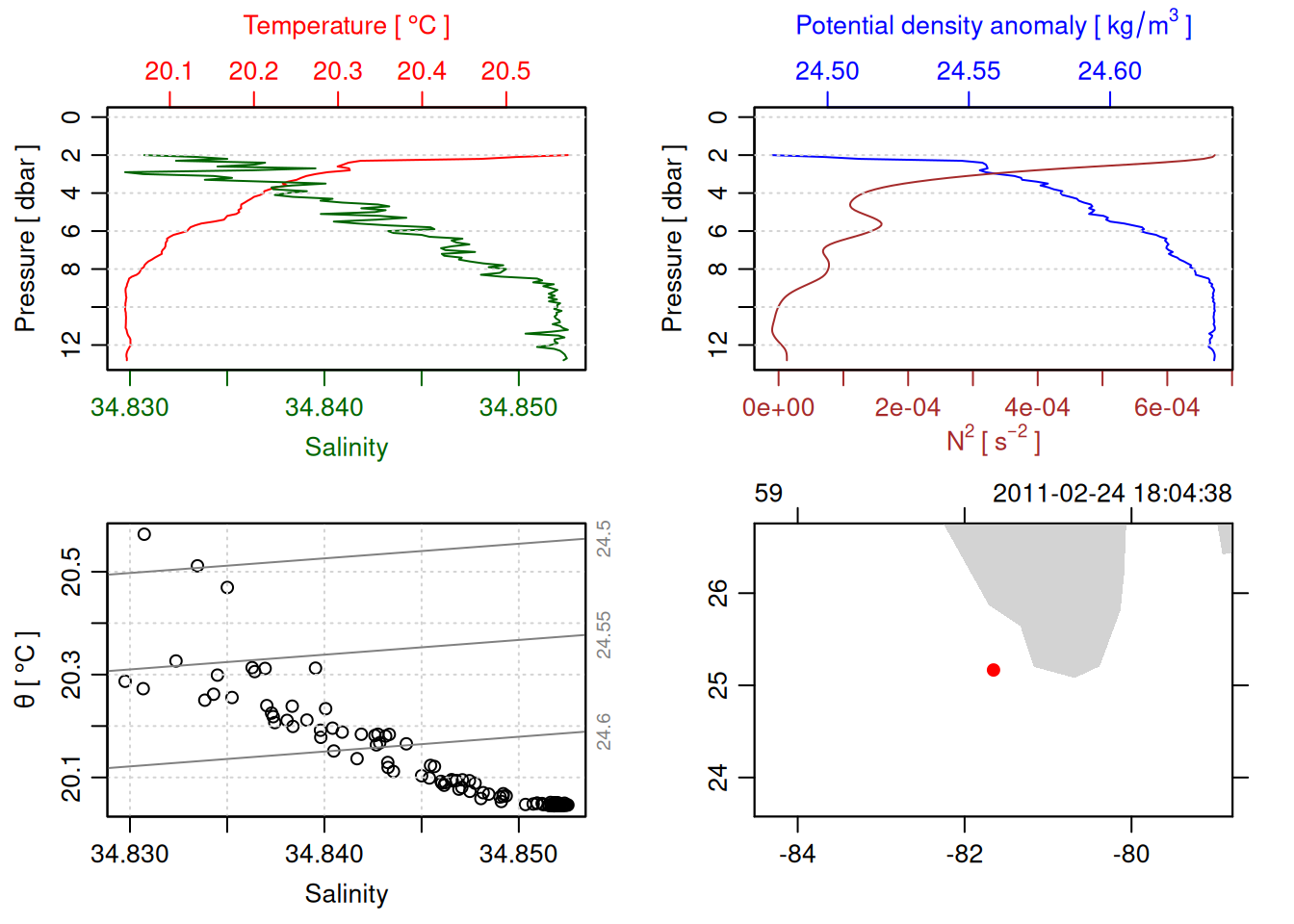 # TODO: Include param here that specifies to handle QC flags. This should be done before converting to a OCE object. QC flag columns are listed in [this spreadsheet](https://docs.google.com/spreadsheets/d/1uCxEmJRqErU-HCQiRQ1FpyiIqtNaGgMSBI0WvrtwBRU/edit?gid=137286311#gid=137286311) and are not supposed to be included in the oce object. QC param values are : # 1 good# 2 +/- 3*std_dev# 4 +/- 5*std_dev# 9 missing# Data column should be set to NA if corresponding QC column has value greater than threshold (recommended threshold is 5*std_dev).# Will need to loop through *_qc columns.# TODO: drop spikes (how? low-pass?).# TODO: combine replicate sensors (eg temp1 temp2).