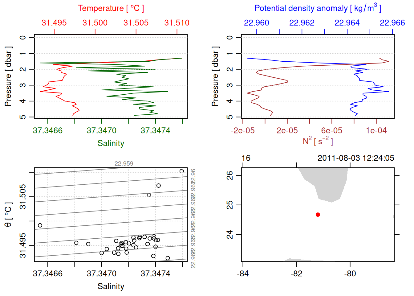 # TODO: Include param here that specifies to handle QC flags. This should be done before converting to a OCE object. QC flag columns are listed in [this spreadsheet](https://docs.google.com/spreadsheets/d/1uCxEmJRqErU-HCQiRQ1FpyiIqtNaGgMSBI0WvrtwBRU/edit?gid=137286311#gid=137286311) and are not supposed to be included in the oce object. QC param values are : # 1 good# 2 +/- 3*std_dev# 4 +/- 5*std_dev# 9 missing# Data column should be set to NA if corresponding QC column has value greater than threshold (recommended threshold is 5*std_dev).# Will need to loop through *_qc columns.# TODO: drop spikes (how? low-pass?).# TODO: combine replicate sensors (eg temp1 temp2).