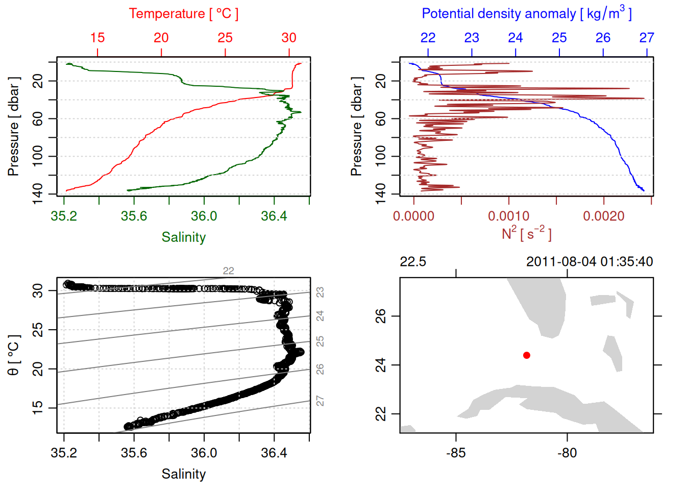 # TODO: Include param here that specifies to handle QC flags. This should be done before converting to a OCE object. QC flag columns are listed in [this spreadsheet](https://docs.google.com/spreadsheets/d/1uCxEmJRqErU-HCQiRQ1FpyiIqtNaGgMSBI0WvrtwBRU/edit?gid=137286311#gid=137286311) and are not supposed to be included in the oce object. QC param values are : # 1 good# 2 +/- 3*std_dev# 4 +/- 5*std_dev# 9 missing# Data column should be set to NA if corresponding QC column has value greater than threshold (recommended threshold is 5*std_dev).# Will need to loop through *_qc columns.# TODO: drop spikes (how? low-pass?).# TODO: combine replicate sensors (eg temp1 temp2).