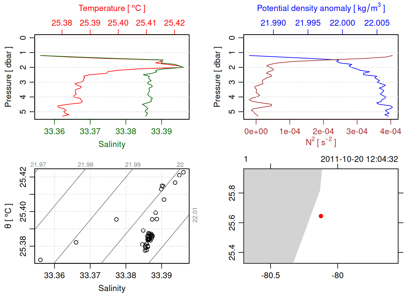 # TODO: Include param here that specifies to handle QC flags. This should be done before converting to a OCE object. QC flag columns are listed in [this spreadsheet](https://docs.google.com/spreadsheets/d/1uCxEmJRqErU-HCQiRQ1FpyiIqtNaGgMSBI0WvrtwBRU/edit?gid=137286311#gid=137286311) and are not supposed to be included in the oce object. QC param values are : # 1 good# 2 +/- 3*std_dev# 4 +/- 5*std_dev# 9 missing# Data column should be set to NA if corresponding QC column has value greater than threshold (recommended threshold is 5*std_dev).# Will need to loop through *_qc columns.# TODO: drop spikes (how? low-pass?).# TODO: combine replicate sensors (eg temp1 temp2).
