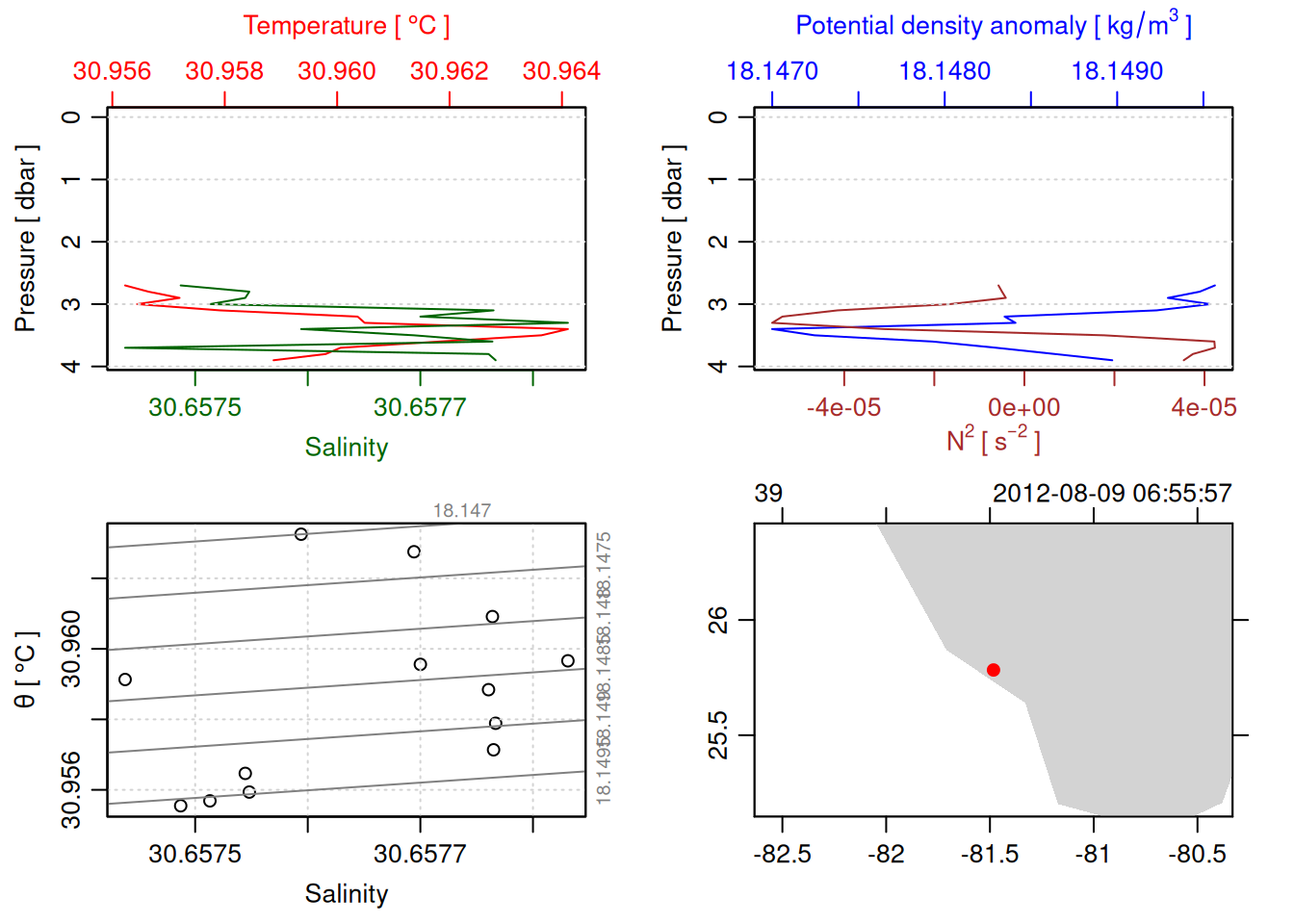# TODO: Include param here that specifies to handle QC flags. This should be done before converting to a OCE object. QC flag columns are listed in [this spreadsheet](https://docs.google.com/spreadsheets/d/1uCxEmJRqErU-HCQiRQ1FpyiIqtNaGgMSBI0WvrtwBRU/edit?gid=137286311#gid=137286311) and are not supposed to be included in the oce object. QC param values are : # 1 good# 2 +/- 3*std_dev# 4 +/- 5*std_dev# 9 missing# Data column should be set to NA if corresponding QC column has value greater than threshold (recommended threshold is 5*std_dev).# Will need to loop through *_qc columns.# TODO: drop spikes (how? low-pass?).# TODO: combine replicate sensors (eg temp1 temp2).