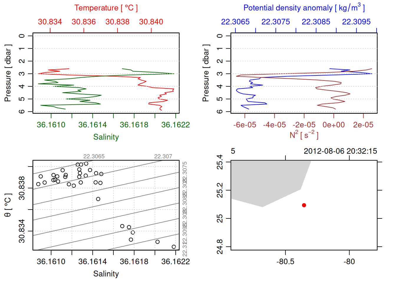 # TODO: Include param here that specifies to handle QC flags. This should be done before converting to a OCE object. QC flag columns are listed in [this spreadsheet](https://docs.google.com/spreadsheets/d/1uCxEmJRqErU-HCQiRQ1FpyiIqtNaGgMSBI0WvrtwBRU/edit?gid=137286311#gid=137286311) and are not supposed to be included in the oce object. QC param values are : # 1 good# 2 +/- 3*std_dev# 4 +/- 5*std_dev# 9 missing# Data column should be set to NA if corresponding QC column has value greater than threshold (recommended threshold is 5*std_dev).# Will need to loop through *_qc columns.# TODO: drop spikes (how? low-pass?).# TODO: combine replicate sensors (eg temp1 temp2).