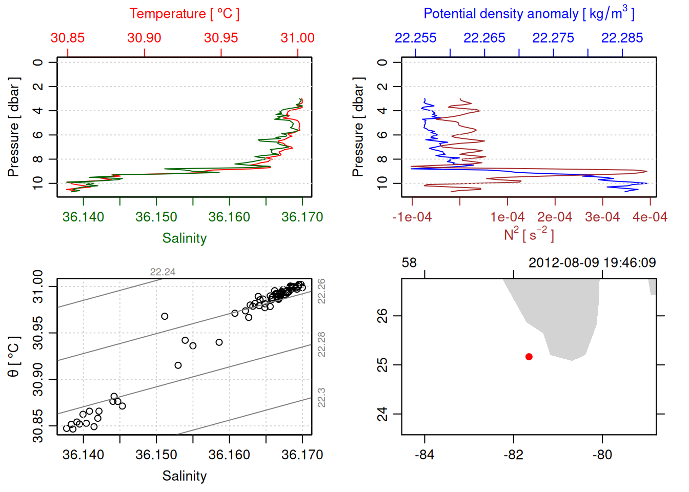 # TODO: Include param here that specifies to handle QC flags. This should be done before converting to a OCE object. QC flag columns are listed in [this spreadsheet](https://docs.google.com/spreadsheets/d/1uCxEmJRqErU-HCQiRQ1FpyiIqtNaGgMSBI0WvrtwBRU/edit?gid=137286311#gid=137286311) and are not supposed to be included in the oce object. QC param values are : # 1 good# 2 +/- 3*std_dev# 4 +/- 5*std_dev# 9 missing# Data column should be set to NA if corresponding QC column has value greater than threshold (recommended threshold is 5*std_dev).# Will need to loop through *_qc columns.# TODO: drop spikes (how? low-pass?).# TODO: combine replicate sensors (eg temp1 temp2).