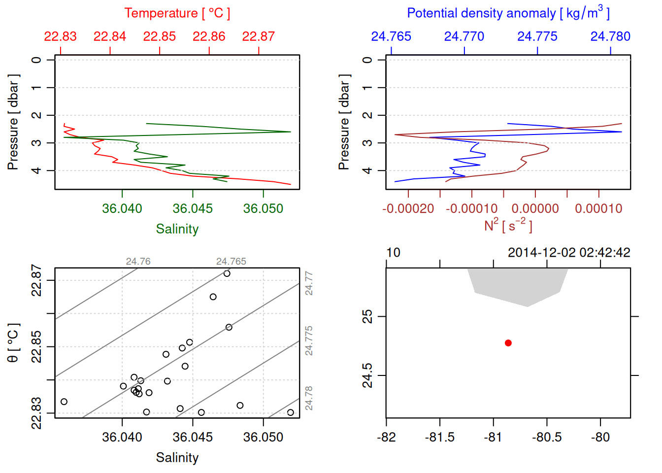 tryCatch({ trimmed_cast <-ctdTrim(cast) decimated_cast <-ctdDecimate(trimmed_cast, p =0.1)# plotting can cause the xlim failureplot(decimated_cast)# === export ===# Get the scan numbers that remain after cleaning cleaned_scans <- decimated_cast@data$scan# Load original raw data to keep all columns ctd_raw <- readr::read_csv(dataFile, show_col_types =FALSE)# Filter raw data to only include the cleaned scans cast_df <- ctd_raw %>%filter(!is.na(sea_water_pressure)) %>%# Remove rows without pressure datamutate(row_num =row_number()) %>%filter(row_num %in% cleaned_scans) %>%select(-row_num)# Add metadata cast_df <-mutate( cast_df,station = station_id,cruise_id = cruise_id )# Check if there are any rows in the cleaned dataif (nrow(cast_df) ==0) {cat("\n=== WARNING: NO DATA AFTER CLEANING ===\n")cat("Cast ID:", params$cast_id, "\n")cat("Station:", station_id, "\n")cat("Cruise:", cruise_id, "\n\n")cat("Raw data rows (with pressure):", sum(!is.na(ctd_raw$sea_water_pressure)), "\n")cat("Cleaned scans to keep:", length(cleaned_scans), "\n")cat("Resulting rows:", nrow(cast_df), "\n\n")cat("Raw data summary:\n")print(summary(ctd_raw[c("sea_water_pressure", "sea_water_temperature", "sea_water_salinity")]))cat("\nCleaned scans (first 20):\n")print(head(cleaned_scans, 20))cat("\n=== CSV FILE NOT CREATED (no data) ===\n\n") } else {# create folder if doesn't exist clean_data_loc <- here::here("data/02_clean")try(fs::dir_create(clean_data_loc))# save ctd to .csv (without row names/indices)write.csv(cast_df, glue("{clean_data_loc}/{params$cast_id}.csv"), row.names =FALSE)cat("Successfully saved", nrow(cast_df), "rows to", glue("{params$cast_id}.csv"), "\n") }}, error =function(e) {cat("\n=== CTD PROCESSING ERROR ===\n")cat("Cast ID:", params$cast_id, "\n")cat("Error message:\n", conditionMessage(e), "\n\n")# Safely inspect objects that might or might not exist when the error happenedif (exists("decimated_cast")) { df <-try(as.data.frame(decimated_cast@data), silent =TRUE)if (!inherits(df, "try-error")) {cat("Dataframe columns:\n")print(names(df))cat("\nSummary of key columns (scan, pressure, temperature, salinity if present):\n") known_cols <-intersect(c("scan", "pressure", "temp", "temperature", "salinity", "conductivity"), names(df))print(summary(df[known_cols], digits =3))cat("\nHead of dataframe:\n")print(head(df)) } else {cat("Could not extract dataframe from decimated_cast.\n") } } else {cat("decimated_cast was never created before the error.\n") }cat("\n=== END ERROR DEBUG INFO ===\n\n")})