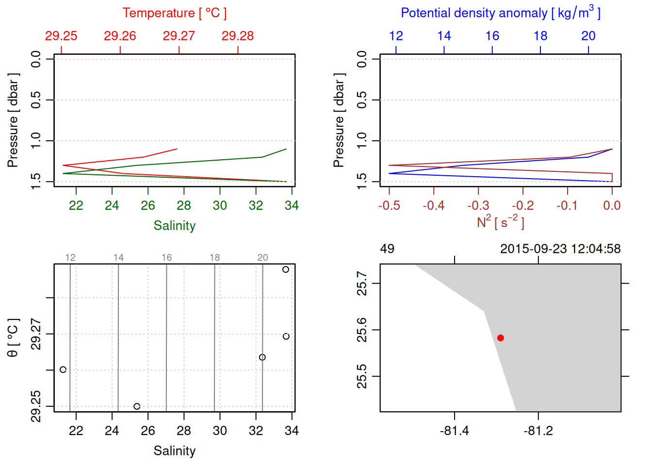 # TODO: Include param here that specifies to handle QC flags. This should be done before converting to a OCE object. QC flag columns are listed in [this spreadsheet](https://docs.google.com/spreadsheets/d/1uCxEmJRqErU-HCQiRQ1FpyiIqtNaGgMSBI0WvrtwBRU/edit?gid=137286311#gid=137286311) and are not supposed to be included in the oce object. QC param values are : # 1 good# 2 +/- 3*std_dev# 4 +/- 5*std_dev# 9 missing# Data column should be set to NA if corresponding QC column has value greater than threshold (recommended threshold is 5*std_dev).# Will need to loop through *_qc columns.# TODO: drop spikes (how? low-pass?).# TODO: combine replicate sensors (eg temp1 temp2).