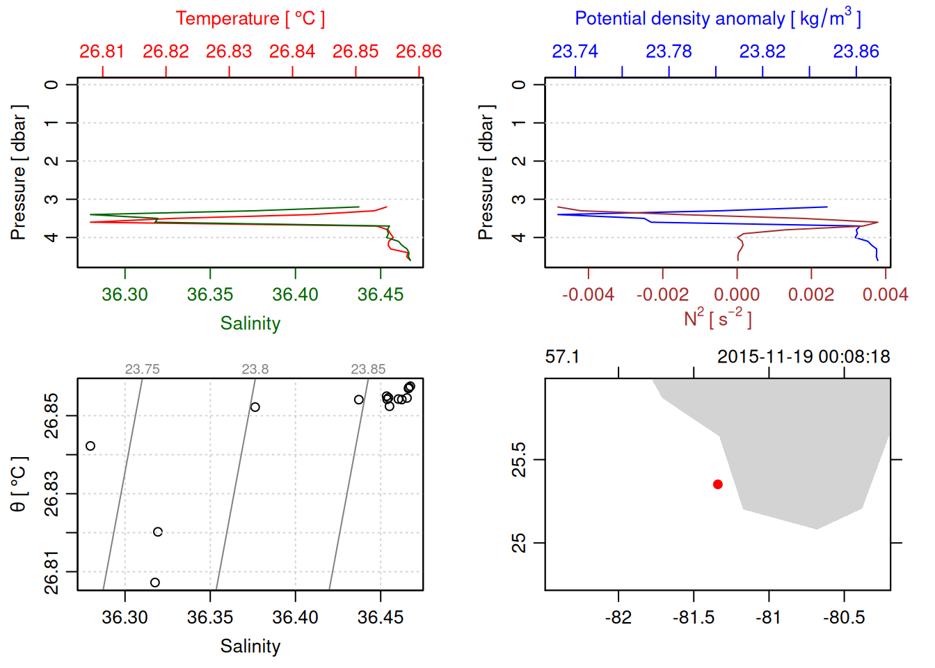 # TODO: Include param here that specifies to handle QC flags. This should be done before converting to a OCE object. QC flag columns are listed in [this spreadsheet](https://docs.google.com/spreadsheets/d/1uCxEmJRqErU-HCQiRQ1FpyiIqtNaGgMSBI0WvrtwBRU/edit?gid=137286311#gid=137286311) and are not supposed to be included in the oce object. QC param values are : # 1 good# 2 +/- 3*std_dev# 4 +/- 5*std_dev# 9 missing# Data column should be set to NA if corresponding QC column has value greater than threshold (recommended threshold is 5*std_dev).# Will need to loop through *_qc columns.# TODO: drop spikes (how? low-pass?).# TODO: combine replicate sensors (eg temp1 temp2).