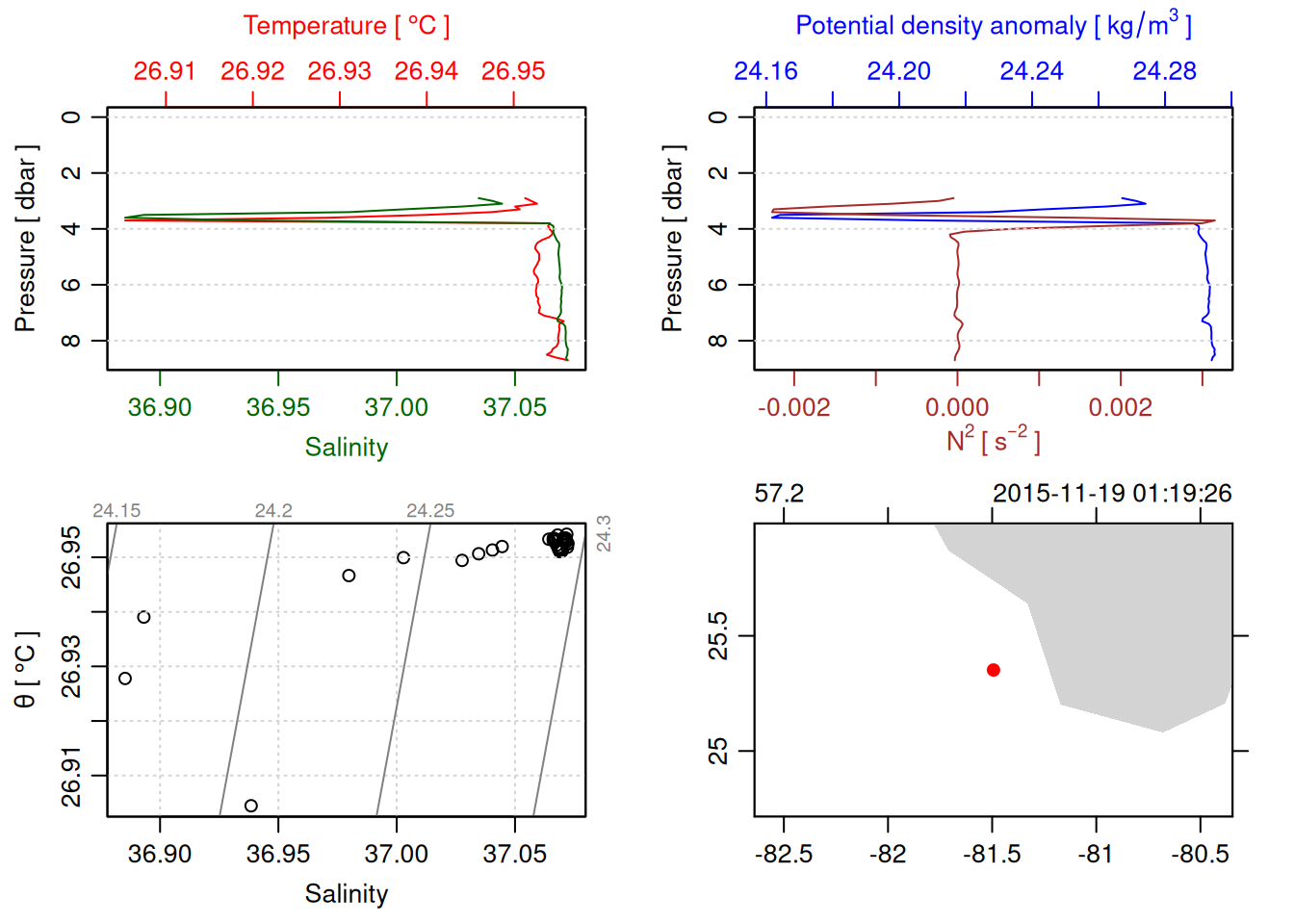 # TODO: Include param here that specifies to handle QC flags. This should be done before converting to a OCE object. QC flag columns are listed in [this spreadsheet](https://docs.google.com/spreadsheets/d/1uCxEmJRqErU-HCQiRQ1FpyiIqtNaGgMSBI0WvrtwBRU/edit?gid=137286311#gid=137286311) and are not supposed to be included in the oce object. QC param values are : # 1 good# 2 +/- 3*std_dev# 4 +/- 5*std_dev# 9 missing# Data column should be set to NA if corresponding QC column has value greater than threshold (recommended threshold is 5*std_dev).# Will need to loop through *_qc columns.# TODO: drop spikes (how? low-pass?).# TODO: combine replicate sensors (eg temp1 temp2).