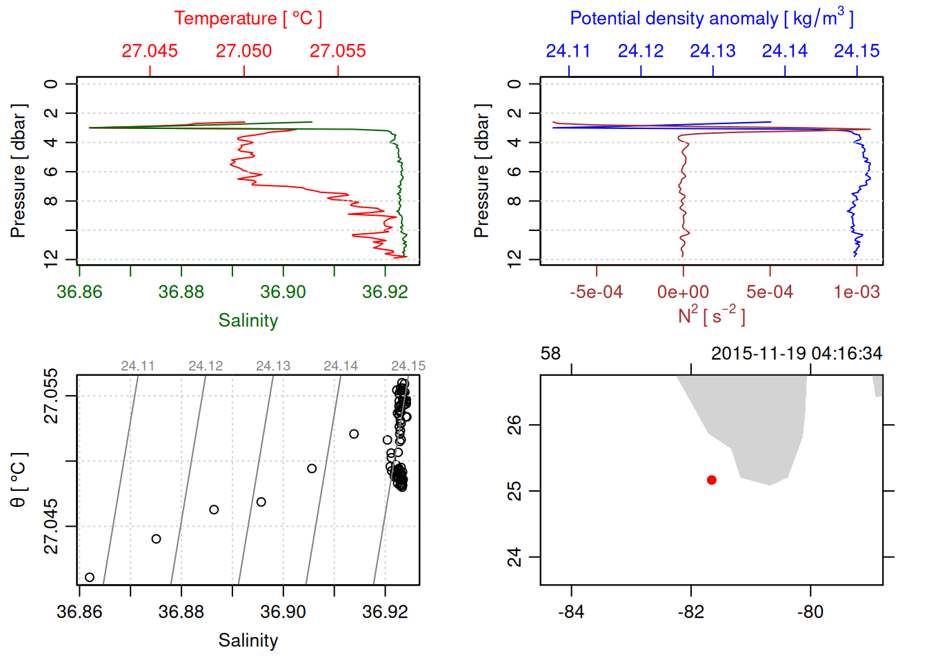 tryCatch({ trimmed_cast <-ctdTrim(cast) decimated_cast <-ctdDecimate(trimmed_cast, p =0.1)# plotting can cause the xlim failureplot(decimated_cast)# === export ===# Get the scan numbers that remain after cleaning cleaned_scans <- decimated_cast@data$scan# Load original raw data to keep all columns ctd_raw <- readr::read_csv(dataFile, show_col_types =FALSE)# Filter raw data to only include the cleaned scans cast_df <- ctd_raw %>%filter(!is.na(sea_water_pressure)) %>%# Remove rows without pressure datamutate(row_num =row_number()) %>%filter(row_num %in% cleaned_scans) %>%select(-row_num)# Add metadata cast_df <-mutate( cast_df,station = station_id,cruise_id = cruise_id )# Check if there are any rows in the cleaned dataif (nrow(cast_df) ==0) {cat("\n=== WARNING: NO DATA AFTER CLEANING ===\n")cat("Cast ID:", params$cast_id, "\n")cat("Station:", station_id, "\n")cat("Cruise:", cruise_id, "\n\n")cat("Raw data rows (with pressure):", sum(!is.na(ctd_raw$sea_water_pressure)), "\n")cat("Cleaned scans to keep:", length(cleaned_scans), "\n")cat("Resulting rows:", nrow(cast_df), "\n\n")cat("Raw data summary:\n")print(summary(ctd_raw[c("sea_water_pressure", "sea_water_temperature", "sea_water_salinity")]))cat("\nCleaned scans (first 20):\n")print(head(cleaned_scans, 20))cat("\n=== CSV FILE NOT CREATED (no data) ===\n\n") } else {# create folder if doesn't exist clean_data_loc <- here::here("data/02_clean")try(fs::dir_create(clean_data_loc))# save ctd to .csv (without row names/indices)write.csv(cast_df, glue("{clean_data_loc}/{params$cast_id}.csv"), row.names =FALSE)cat("Successfully saved", nrow(cast_df), "rows to", glue("{params$cast_id}.csv"), "\n") }}, error =function(e) {cat("\n=== CTD PROCESSING ERROR ===\n")cat("Cast ID:", params$cast_id, "\n")cat("Error message:\n", conditionMessage(e), "\n\n")# Safely inspect objects that might or might not exist when the error happenedif (exists("decimated_cast")) { df <-try(as.data.frame(decimated_cast@data), silent =TRUE)if (!inherits(df, "try-error")) {cat("Dataframe columns:\n")print(names(df))cat("\nSummary of key columns (scan, pressure, temperature, salinity if present):\n") known_cols <-intersect(c("scan", "pressure", "temp", "temperature", "salinity", "conductivity"), names(df))print(summary(df[known_cols], digits =3))cat("\nHead of dataframe:\n")print(head(df)) } else {cat("Could not extract dataframe from decimated_cast.\n") } } else {cat("decimated_cast was never created before the error.\n") }cat("\n=== END ERROR DEBUG INFO ===\n\n")})