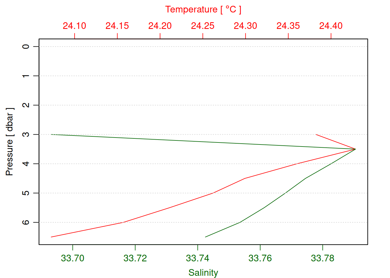 tryCatch({ oce::plotProfile(decimated_cast)# TODO: plot chl & do (prereq handle other_params in ctd_load_from_csv call above)}, error =function(e) {print("decimated cast not found")})