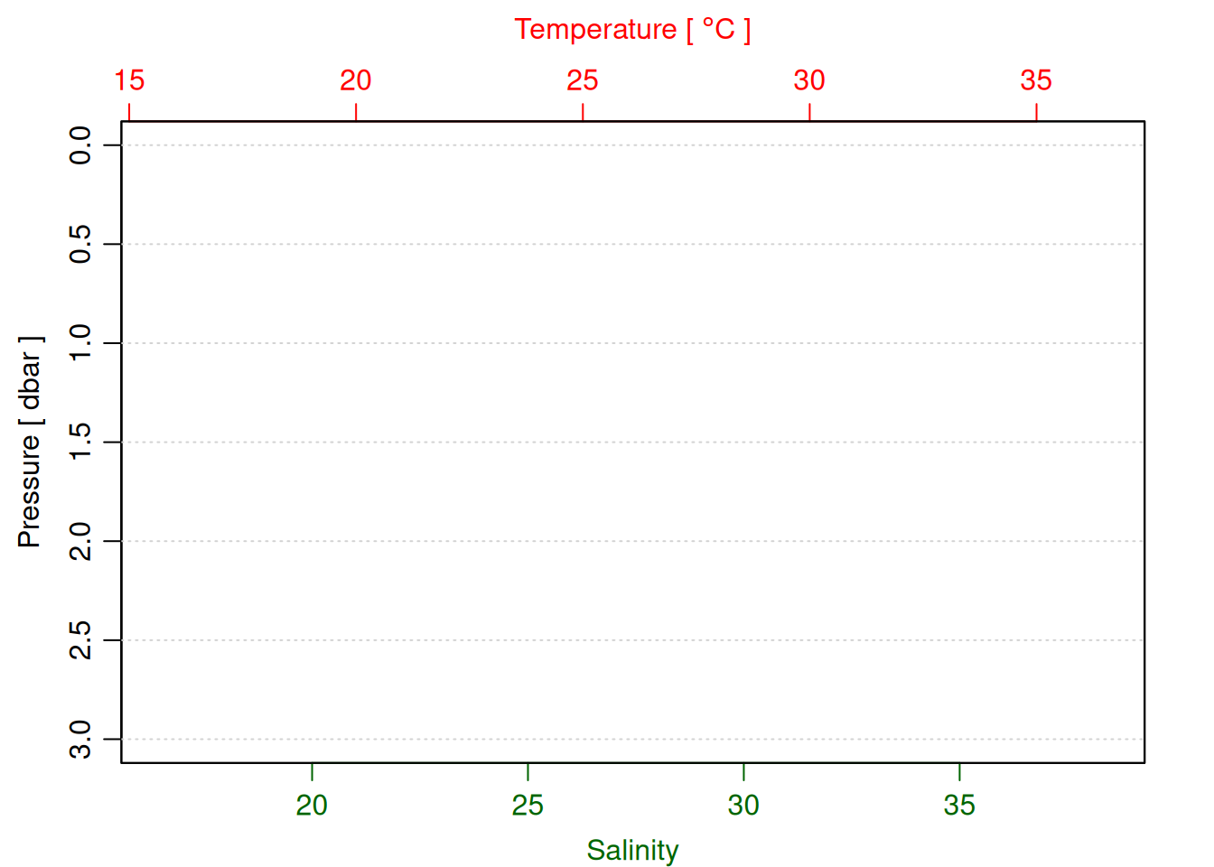 tryCatch({ oce::plotProfile(decimated_cast)# TODO: plot chl & do (prereq handle other_params in ctd_load_from_csv call above)}, error =function(e) {print("decimated cast not found")})