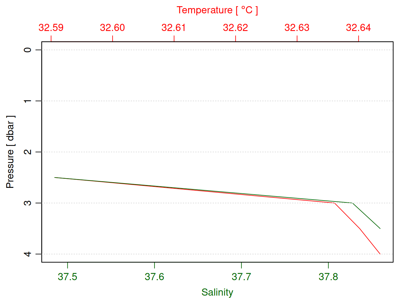 tryCatch({ oce::plotProfile(decimated_cast)# TODO: plot chl & do (prereq handle other_params in ctd_load_from_csv call above)}, error =function(e) {print("decimated cast not found")})