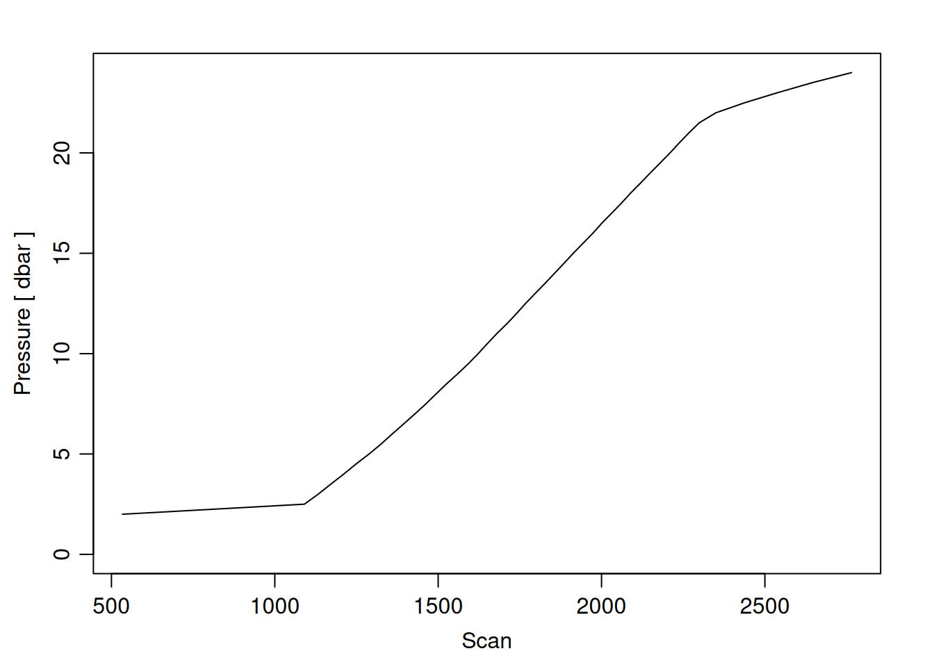 tryCatch({ trimmed_cast <-ctdTrim(cast) decimated_cast <-ctdDecimate(trimmed_cast, p =0.5)# plotting can cause the xlim failureplotScan(decimated_cast)# === export === cast_df <-as.data.frame(decimated_cast@data)# Add metadata cast_df <-mutate( cast_df,station = station_id,cruise_id = cruise_id )# drop NA rows left by cleaning cast_df <-subset(cast_df, !is.na(scan))# create folder if doesn't exist clean_data_loc <- here::here("data/02_clean")try(fs::dir_create(clean_data_loc))# save ctd to .csvwrite.csv(cast_df, glue("{clean_data_loc}/{params$cast_id}.csv"))}, error =function(e) {cat("\n=== CTD PROCESSING ERROR ===\n")cat("Cast ID:", params$cast_id, "\n")cat("Error message:\n", conditionMessage(e), "\n\n")# Safely inspect objects that might or might not exist when the error happenedif (exists("decimated_cast")) { df <-try(as.data.frame(decimated_cast@data), silent =TRUE)if (!inherits(df, "try-error")) {cat("Dataframe columns:\n")print(names(df))cat("\nSummary of key columns (scan, pressure, temperature, salinity if present):\n") known_cols <-intersect(c("scan", "pressure", "temp", "temperature", "salinity", "conductivity"), names(df))print(summary(df[known_cols], digits =3))cat("\nHead of dataframe:\n")print(head(df)) } else {cat("Could not extract dataframe from decimated_cast.\n") } } else {cat("decimated_cast was never created before the error.\n") }cat("\n=== END ERROR DEBUG INFO ===\n\n")})