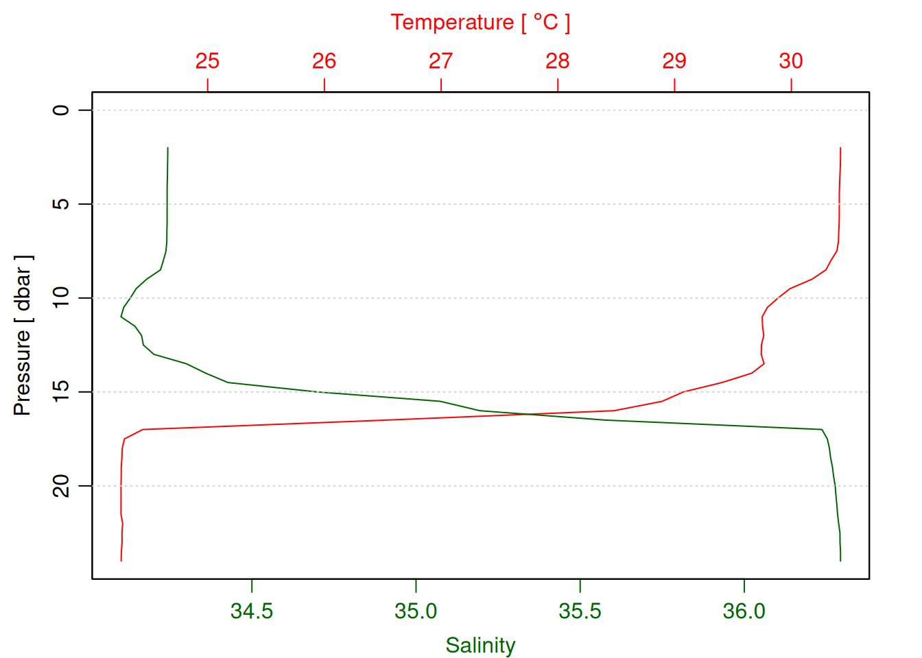 tryCatch({ oce::plotProfile(decimated_cast)# TODO: plot chl & do (prereq handle other_params in ctd_load_from_csv call above)}, error =function(e) {print("decimated cast not found")})