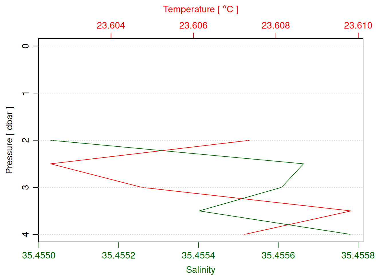 tryCatch({ oce::plotProfile(decimated_cast)# TODO: plot chl & do (prereq handle other_params in ctd_load_from_csv call above)}, error =function(e) {print("decimated cast not found")})