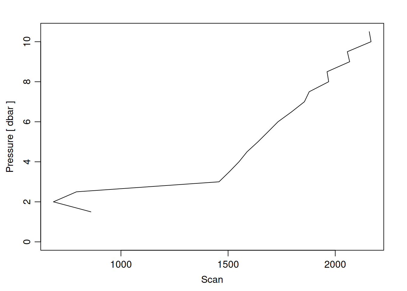 tryCatch({ trimmed_cast <-ctdTrim(cast) decimated_cast <-ctdDecimate(trimmed_cast, p =0.5)# plotting can cause the xlim failureplotScan(decimated_cast)# === export === cast_df <-as.data.frame(decimated_cast@data)# Add metadata cast_df <-mutate( cast_df,station = station_id,cruise_id = cruise_id )# drop NA rows left by cleaning cast_df <-subset(cast_df, !is.na(scan))# create folder if doesn't exist clean_data_loc <- here::here("data/02_clean")try(fs::dir_create(clean_data_loc))# save ctd to .csvwrite.csv(cast_df, glue("{clean_data_loc}/{params$cast_id}.csv"))}, error =function(e) {cat("\n=== CTD PROCESSING ERROR ===\n")cat("Cast ID:", params$cast_id, "\n")cat("Error message:\n", conditionMessage(e), "\n\n")# Safely inspect objects that might or might not exist when the error happenedif (exists("decimated_cast")) { df <-try(as.data.frame(decimated_cast@data), silent =TRUE)if (!inherits(df, "try-error")) {cat("Dataframe columns:\n")print(names(df))cat("\nSummary of key columns (scan, pressure, temperature, salinity if present):\n") known_cols <-intersect(c("scan", "pressure", "temp", "temperature", "salinity", "conductivity"), names(df))print(summary(df[known_cols], digits =3))cat("\nHead of dataframe:\n")print(head(df)) } else {cat("Could not extract dataframe from decimated_cast.\n") } } else {cat("decimated_cast was never created before the error.\n") }cat("\n=== END ERROR DEBUG INFO ===\n\n")})